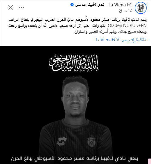 ونعى نادي لافيينا برئاسة محمود الأسيوطي عبر صفحته الرسمية على موقع التواصل الاجتماعي فيس بوك ببالغ الحزن المدرب النيجيري بقطاع البراعم Oladeji NURUDEEN الذي وافته المنية إثر أزمة صحية داعين الله أن يتغمده بواسع رحمته ويدخله فسيح جناته، ويلهم أسرته الصبر والسلوان.