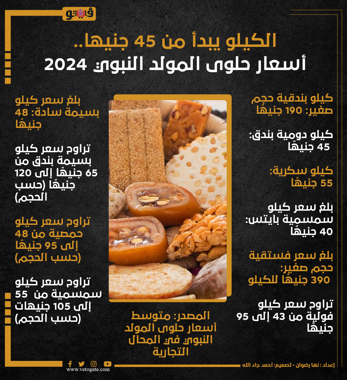 الكيلو يبدأ من 45 جنيها.. أسعار حلوى المولد النبوي 2024 (إنفوجراف) الخميس 22/أغسطس/2024 - 12:00 م 8/22/2024 12:00:10 PM أسعار حلوى المولد النبوي في المحال التجارية، فيتو نها رضوان شارك طباعة 18 حجم الخط شارك طباعة أسعار حلاوة المولد النبوي 2024 سعر حلاوة المولد النبوي 2024 سعر حلوى المولد النبوي 2024 أسعار حلوى المولد النبوي 2024 حلاوة المولد 2024 حلوى المولد 2024 المولد النبوي 2024 مولد النبي 2024 حلاوة المولد موسم حلاوة المولد النبوي 2024
