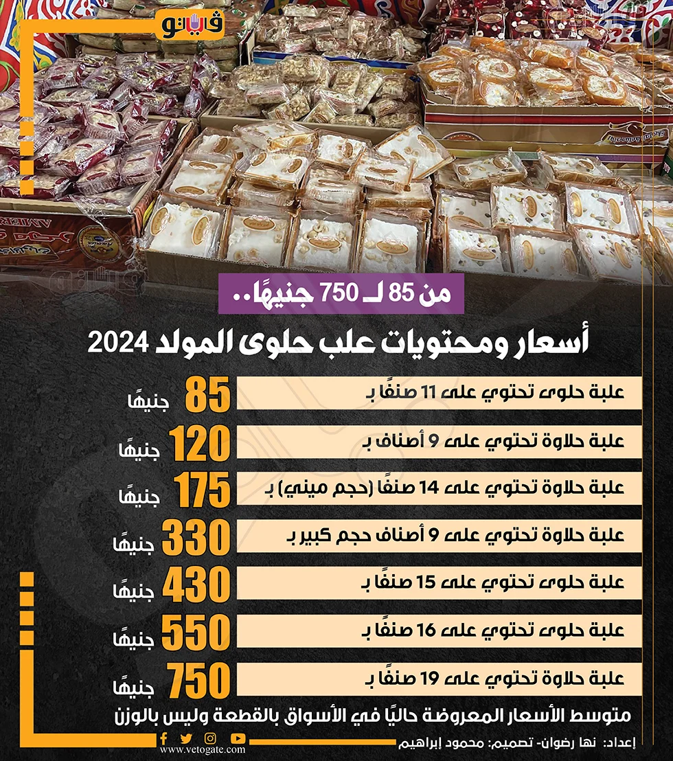 «فيتو» تستعرض أسعار علب حلاوة المولد النبوي 2024؛ التي تبدأ من 85 جنيهًا وحتى أقل 800 جنيه، ومحتويات علب حلوى المولد النبوي؛ في السطور الآتية: