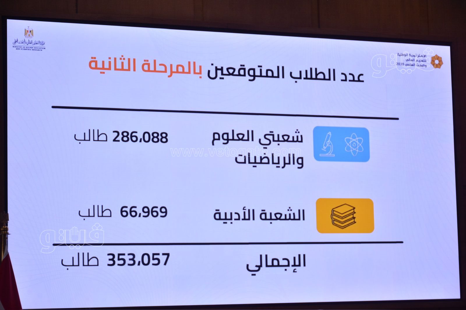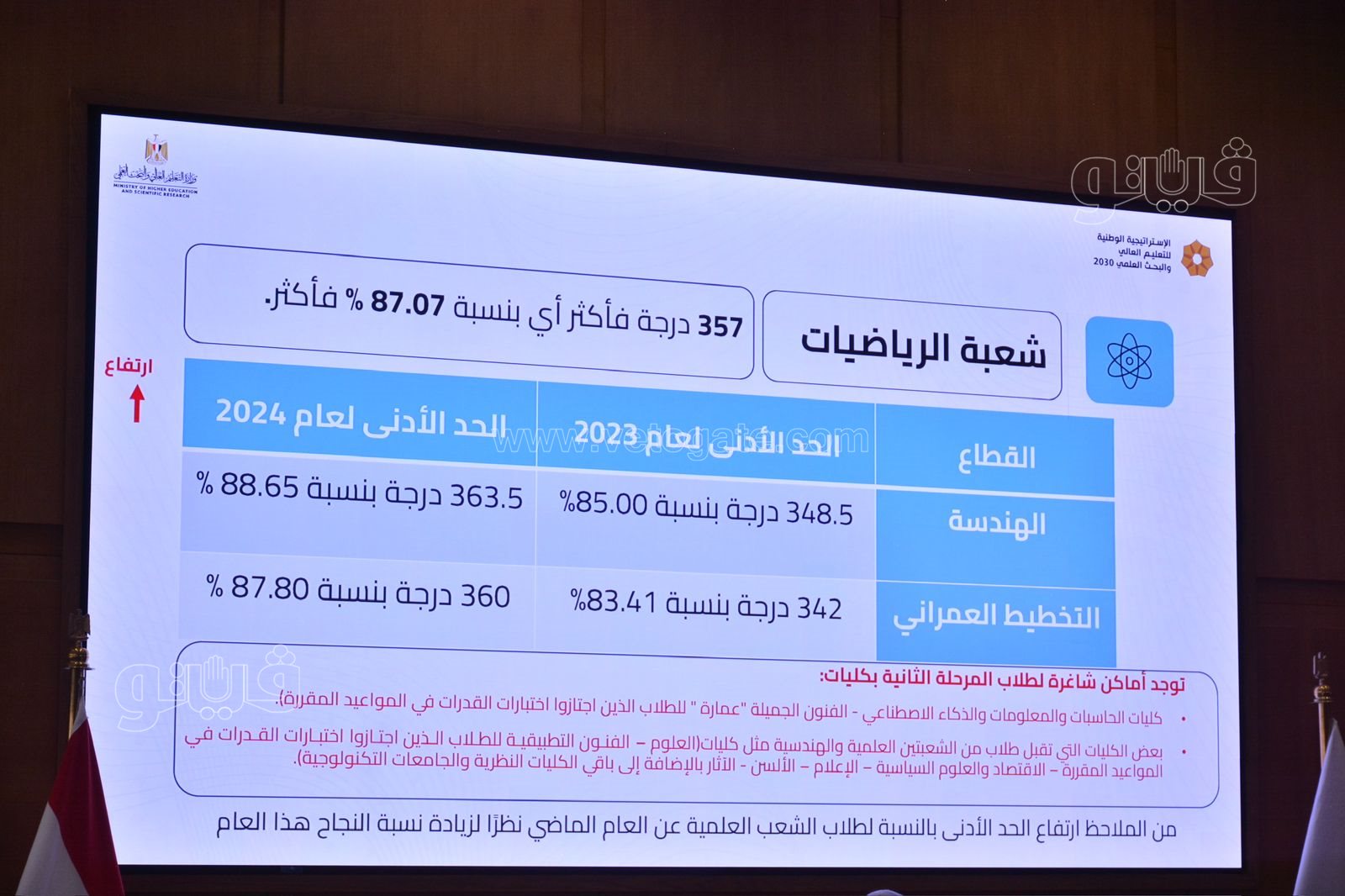 ☆ الشعبة الأدبية: 280 درجة فأكثر أي بنسبة 68.29% فأكثر، بإجمالي عدد الطلاب: 73995. وبهذا يكون إجمالي عدد الطلاب المتقدمين للتسجيل بالمرحلة الأولى 113200.