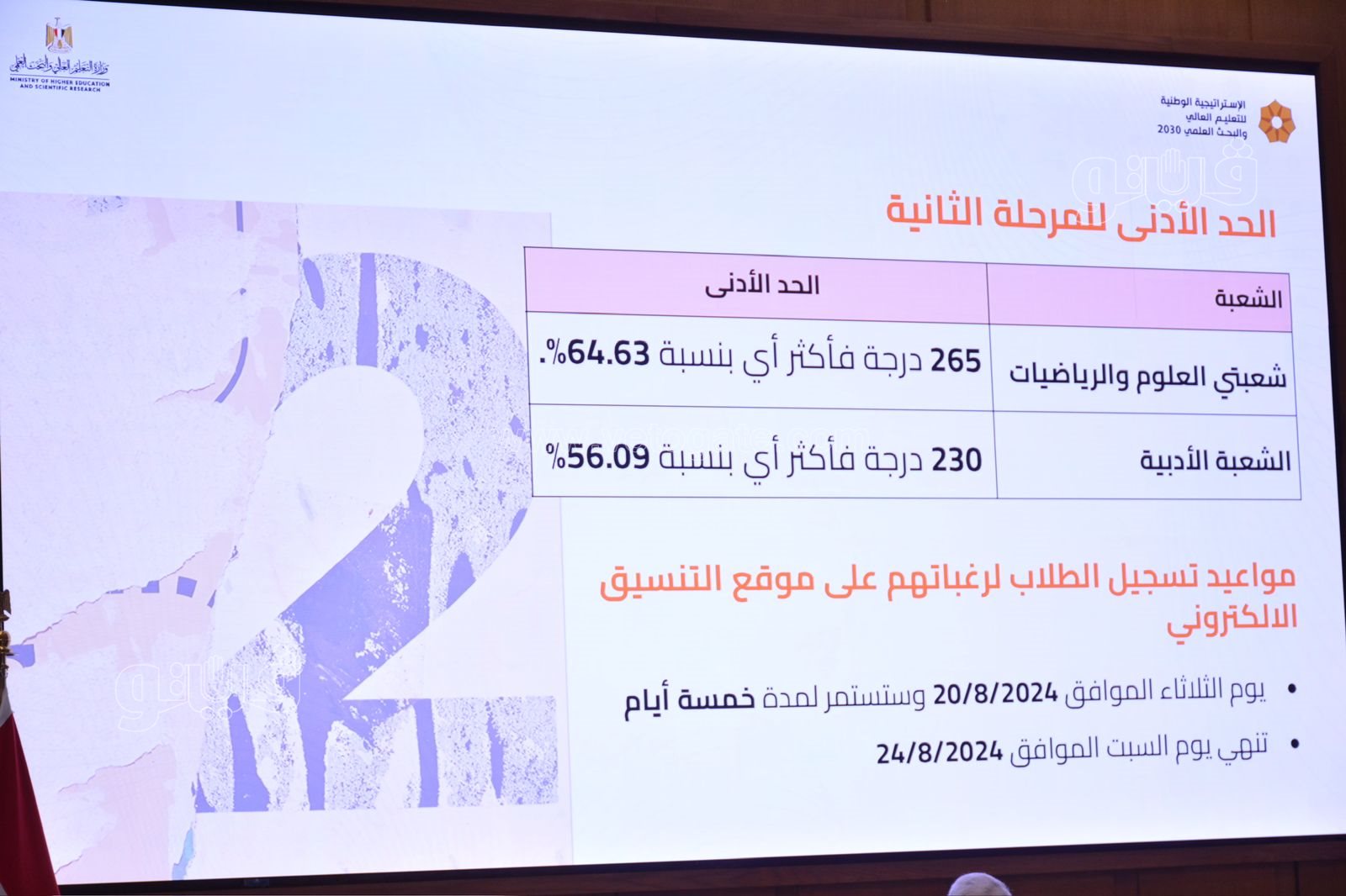 تنسيق الجامعات 2024، وكان قد تقرر فتح موقع التنسيق الإلكتروني لتسجيل الرغبات للمرحلة الأولى اعتبارًا من يوم الإثنين الموافق 12/8/2024، وحتى يوم الجمعة الموافق 16/8/2024، وذلك وفقًا للحد الأدنى التالي: