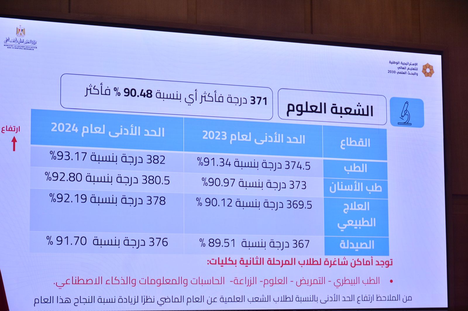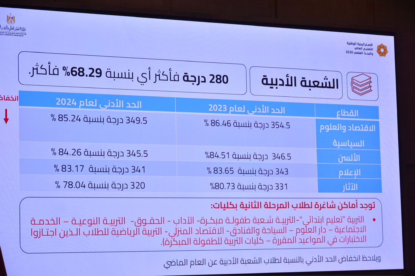 ☆ الشعبة الأدبية: 280 درجة فأكثر أي بنسبة 68.29% فأكثر، بإجمالي عدد الطلاب: 73995. وبهذا يكون إجمالي عدد الطلاب المتقدمين للتسجيل بالمرحلة الأولى 113200.