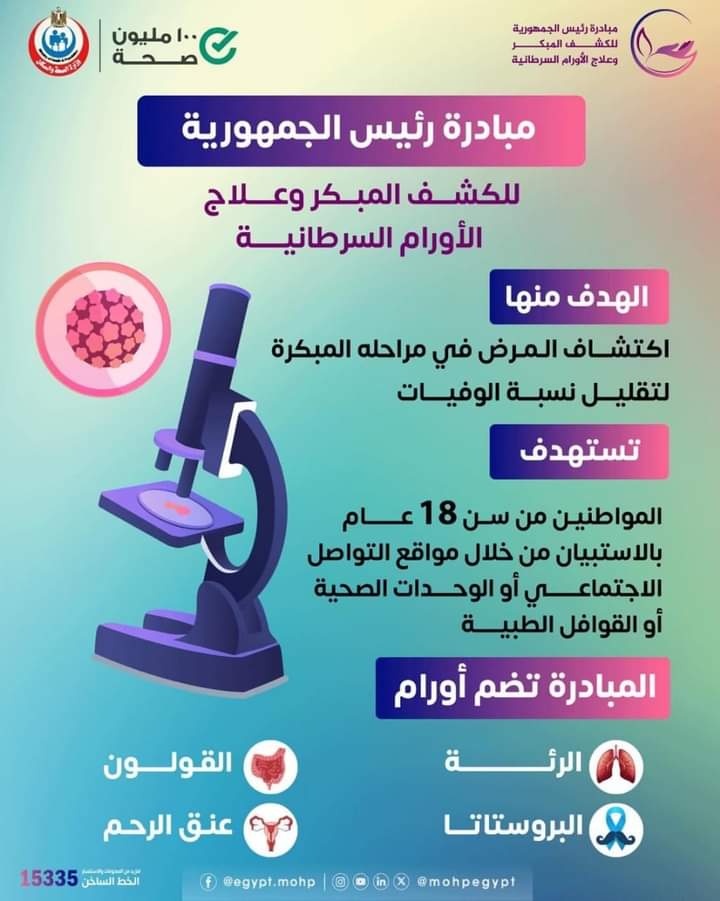 وأكد الدكتور شريف صبحي وكيل وزارة الصحة والسكان بالوادي الجديد، في حديث خاص لجريدة «ڤيتو»، أن المبادرة الرئاسية للكشف المبكر وعلاج الأورام السرطانية، يتم من خلالها الكشف عن سرطان «الرئة، البروستاتا، القولون، عنق الرحم» بالمجان، وتستهدف المبادرة الرئاسية فحص المواطنين من سن 18 عامًا فأكثر، بهدف الكشف عن الأورام في المراحل المبكرة وعلاجها، مما يساهم في تقليل نسبة الوفيات الناجمة عن المرض، وتقليل العبء المادي الذي يسببه تشخيص الأورام في المراحل المتأخرة، بالإضافة إلى تقديم خدمة المساعدة في الإقلاع عن التدخين.