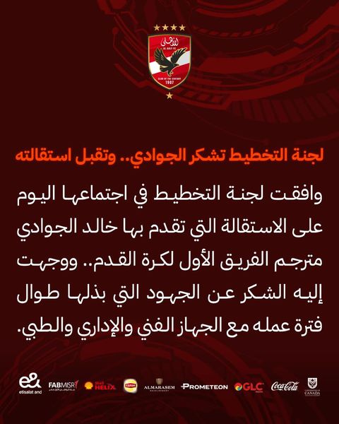 أعلن النادي الأهلي في بيان رسمي عن رحيل خالد الجوادي مترجم الفريق الأول لكرة القدم بالنادي بعدما وافقت لجنة التخطيط في اجتماعها اليوم على الاستقالة التي تقدم بها.