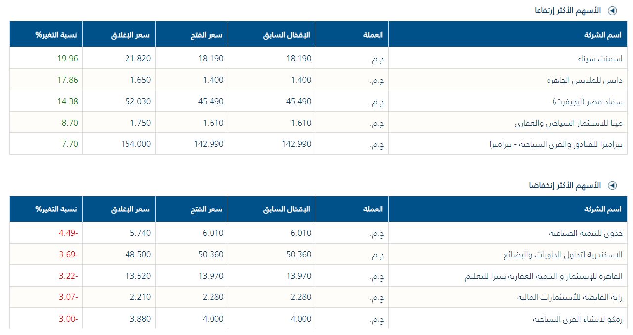 البورصة المصرية، الأسهم الأكثر ارتفاعا وانخفاضا بتداولات اليوم الأحد