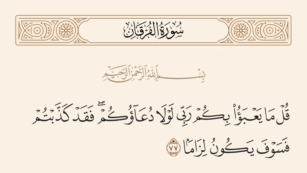 قال تعالى: «قُلْ مَا يَعْبَأُ بِكُمْ رَبِّي لَوْلَا دُعَاؤُكُمْ فَقَدْ كَذَّبْتُمْ فَسَوْفَ يَكُونُ لِزَامًا».