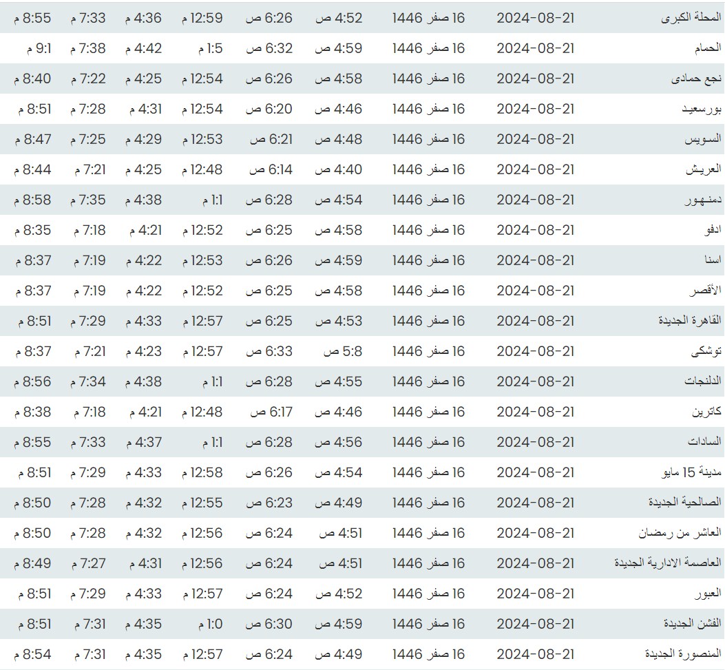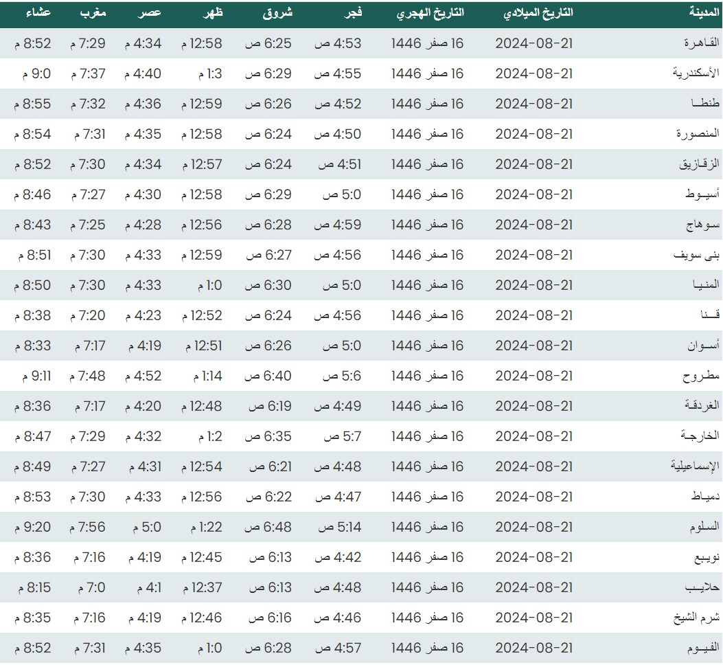 مواقيت الصلاة اليوم وفقًا للتوقيت المحلي لمدينتي القاهرة والإسكندرية وكذلك،مواقيت الصلاة، لعدد من مدن ومحافظات الجمهورية من واقع بيانات الهيئة العامة للمساحة