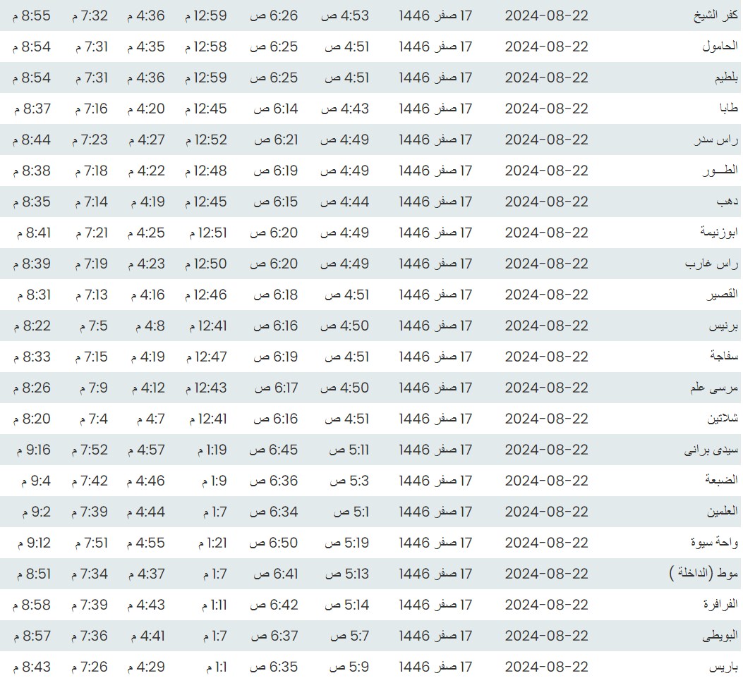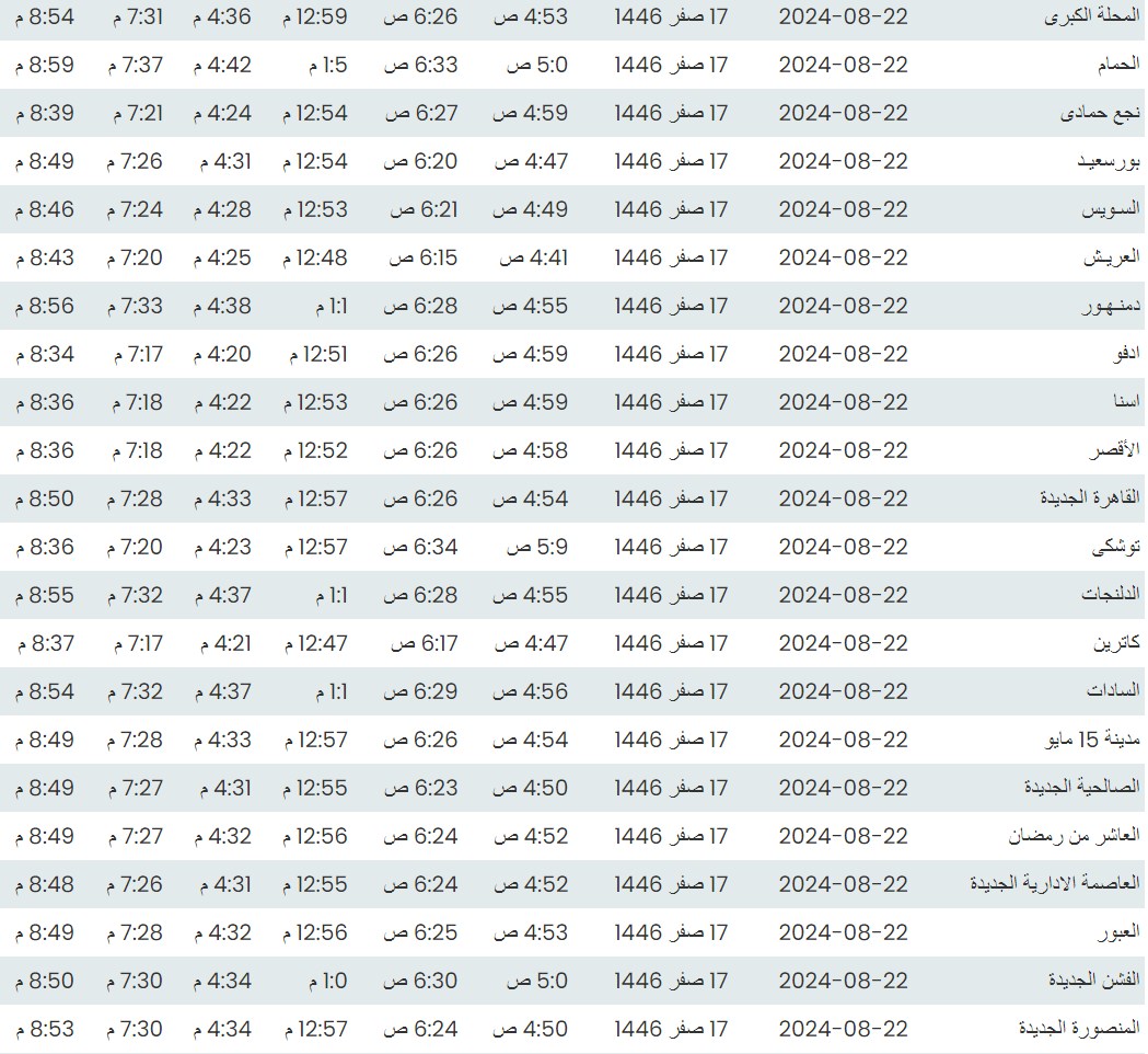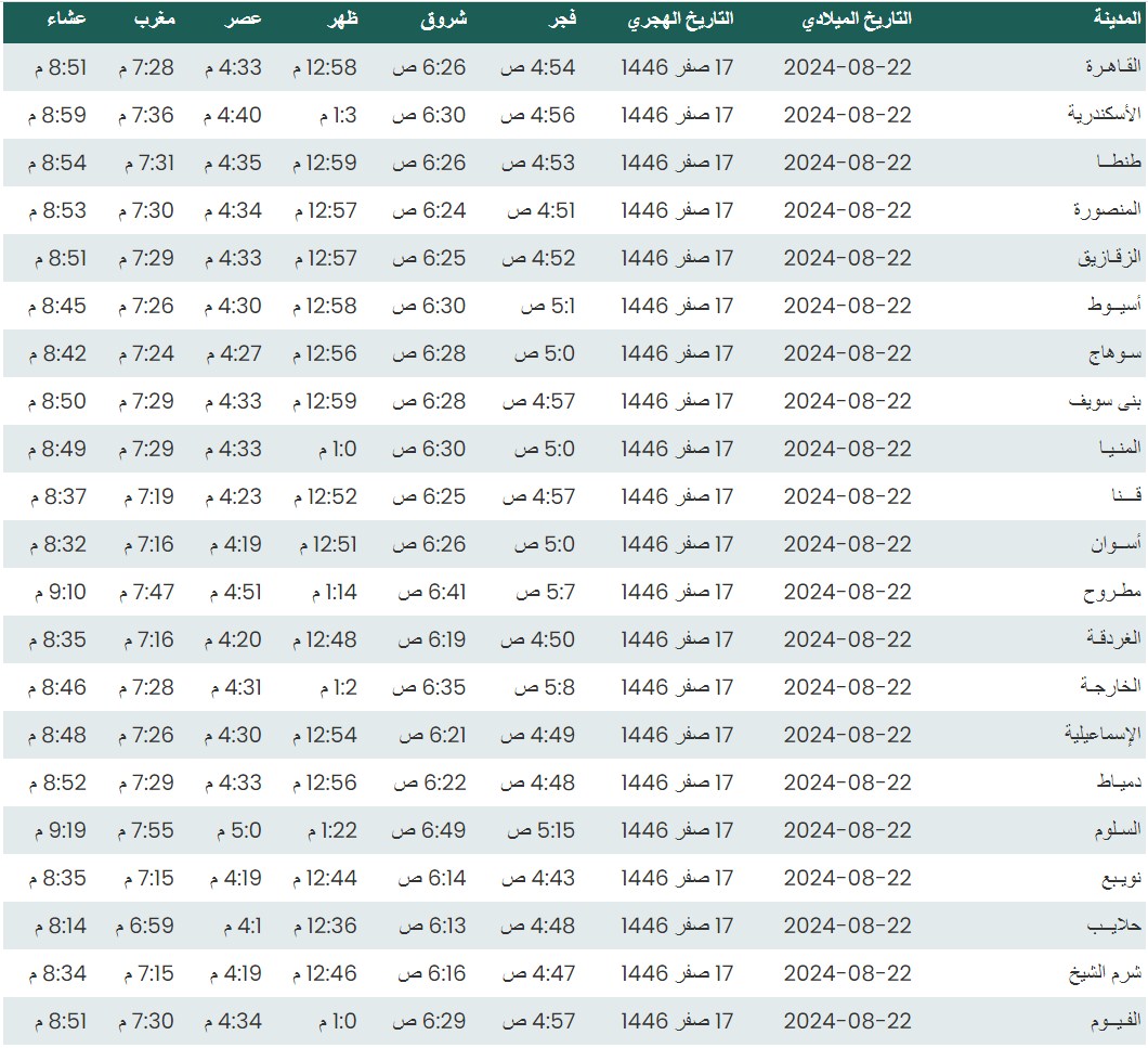 وفيما يلي مواقيت الصلاة، لعدد من مدن ومحافظات الجمهورية من واقع بيانات الهيئة العامة للمساحة