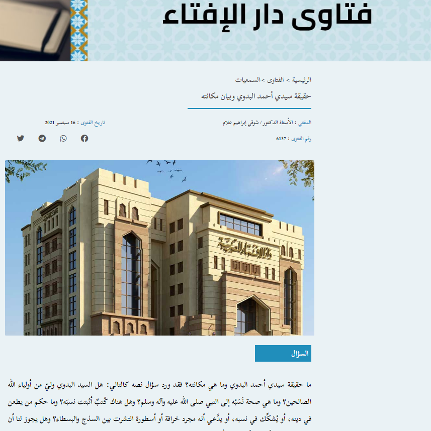 السيد البدوي، تداول نشطاء مواقع التواصل الاجتماعي فتوى لدار الإفتاء عن شيخ الصوفيين في طنطا السيد البدوي، والذي زعم النشطاء أنها فتوى جديدة لمفتي الجمهورية الجديد الدكتور نظير عياد، والتي جاء فيها أن "السيد أحمد البدوي رضي الله عنه، سليل آل البيت، وإمام وولي ووارث نبوي رباني، ومحبته وزيارته أمارة على الصلاح".