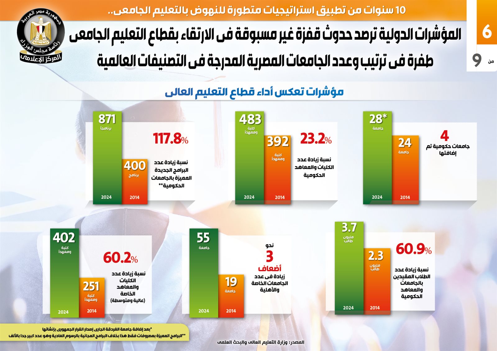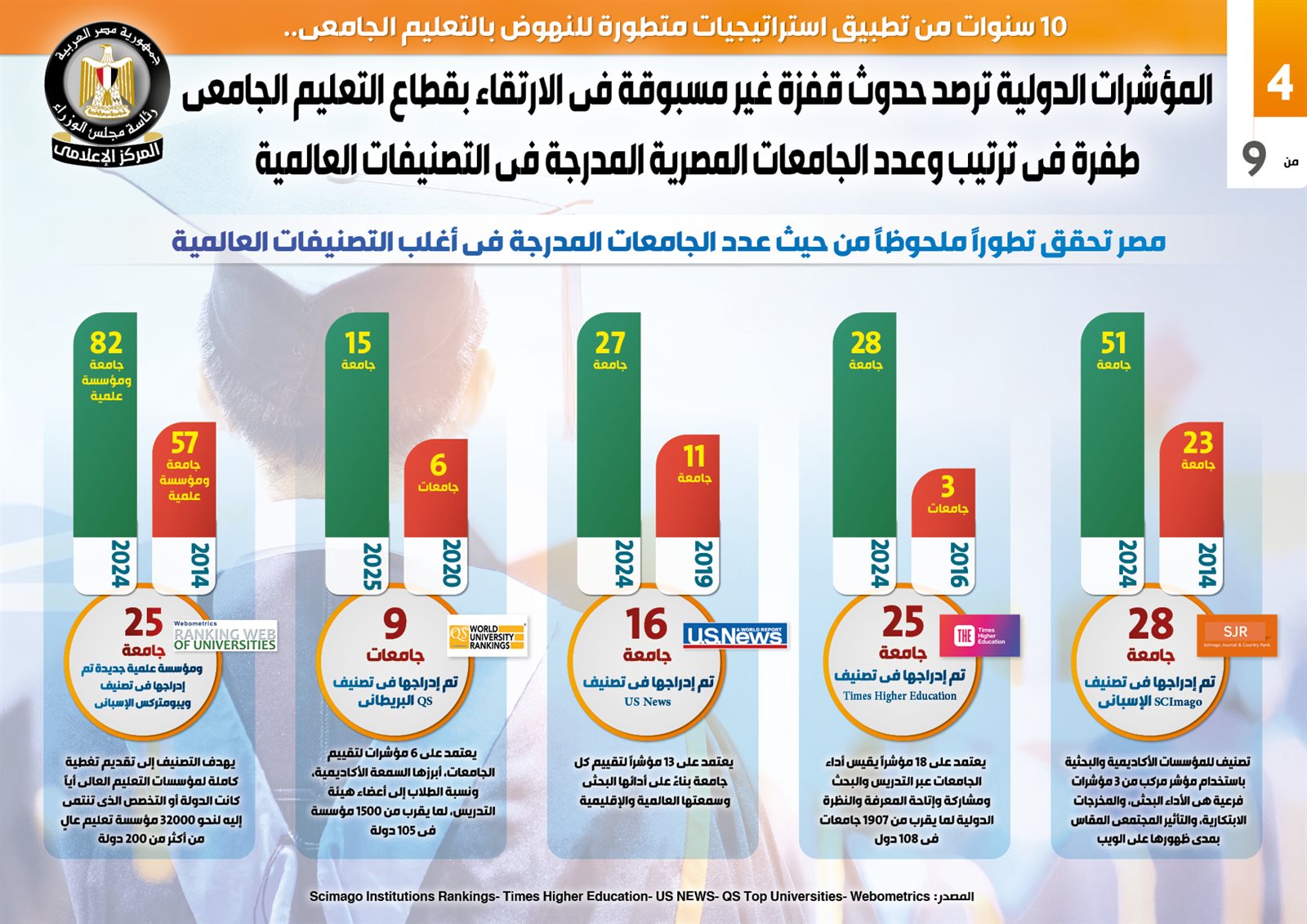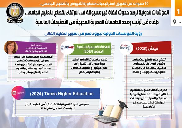 وفي هذا الصدد نشر المركز الإعلامي لـ مجلس الوزراء تقريرًا تضمن إنفوجرافات تسلط الضوء على المؤشرات الدولية التي رصدت حدوث قفزة غير مسبوقة في الارتقاء بقطاع التعليم الجامعي، والطفرة في ترتيب وعدد الجامعات المصرية المدرجة في التصنيفات العالمية، وذلك عقب 10 سنوات من تطبيق استراتيجيات متطورة للنهوض بالتعليم الجامعي.