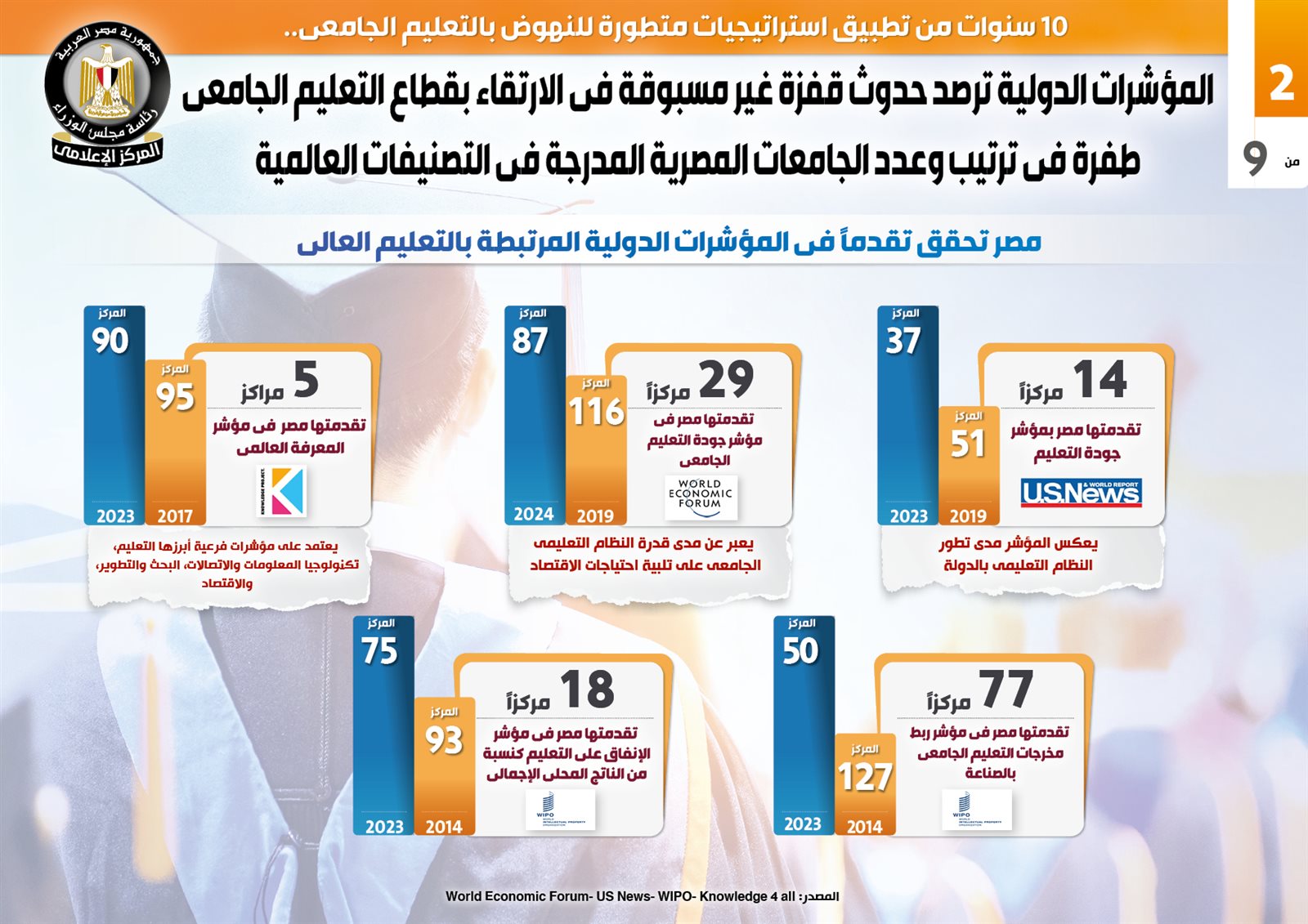 كما أظهر التقرير تقدم مصر في مؤشر ربط مخرجات التعليم الجامعي بالصناعة الصادر عن "WIPO" 77 مركزًا لتشغل المركز 50 عام 2023، مقابل المركز 127 عام 2014، فضلًا عن تقدم مصر 18 مركزًا في مؤشر الإنفاق على التعليم كنسبة من الناتج المحلي الإجمالي، لتشغل المركز 75 عام 2023، مقابل المركز 93 عام 2014.