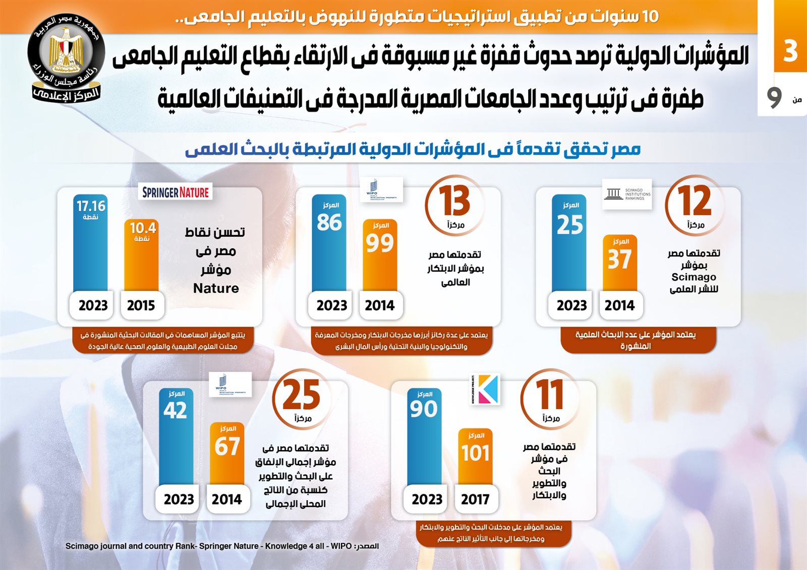 ولفت التقرير تحقيق مصر تقدمًا في المؤشرات الدولية المرتبطة بالبحث العلمي، حيث تقدمت 12 مركزًا بمؤشر "Scimago" للنشر العلمي، لتشغل المركز 25 عام 2023، مقابل المركز 37 عام 2014، علمًا بأن المؤشر يعتمد على عدد الأبحاث العلمية المنشورة، بجانب تقدم مصر 13 مركزًا بمؤشر الابتكار العالمي، لتشغل المركز 86 عام 2023، مقارنة بالمركز 99 عام 2014، علمًا بأن المؤشر يعتمد على عدة ركائز أبرزها مخرجات الابتكار ومخرجات المعرفة والتكنولوجيا والبنية التحتية ورأس المال البشري.