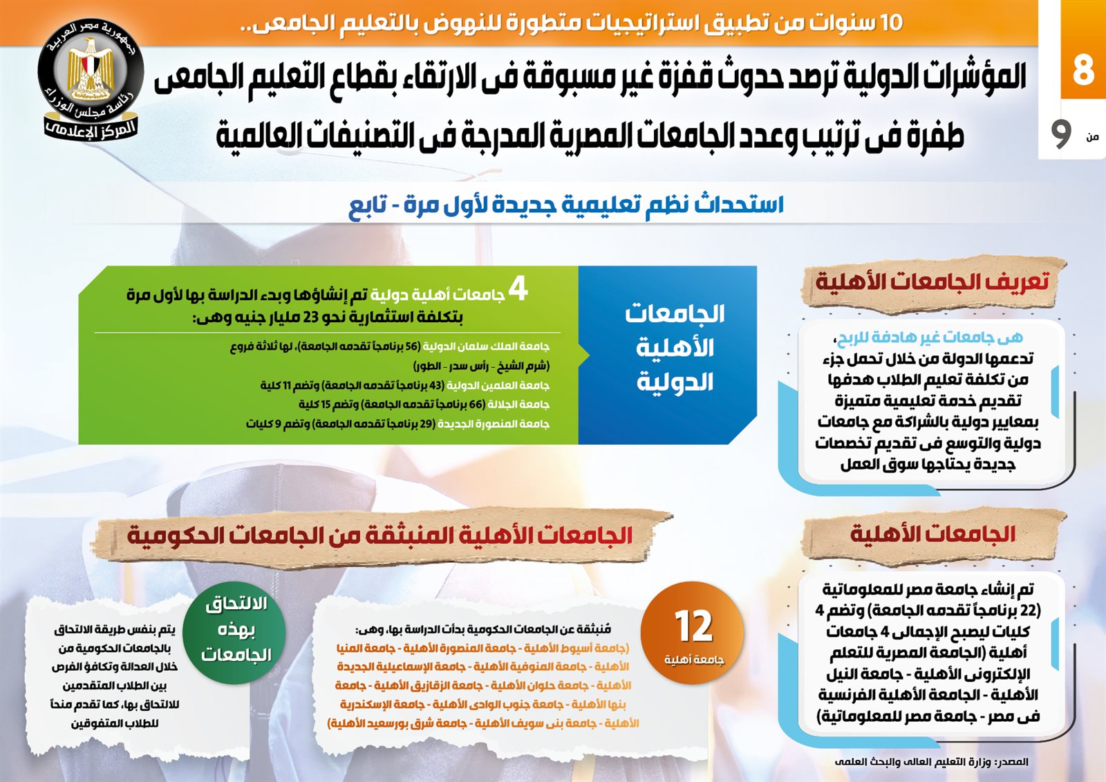 وأشار التقرير إلى أنه تم إنشاء جامعة مصر المعلوماتية (22 برنامجًا تقدمه الجامعة) وتضم 4 كليات ليصبح الإجمالي 4 جامعات أهلية (الجامعة المصرية للتعلم الإلكتروني الأهلية - جامعة النيل الأهلية - الجامعة الأهلية الفرنسية في مصر - جامعة مصر للمعلوماتية).