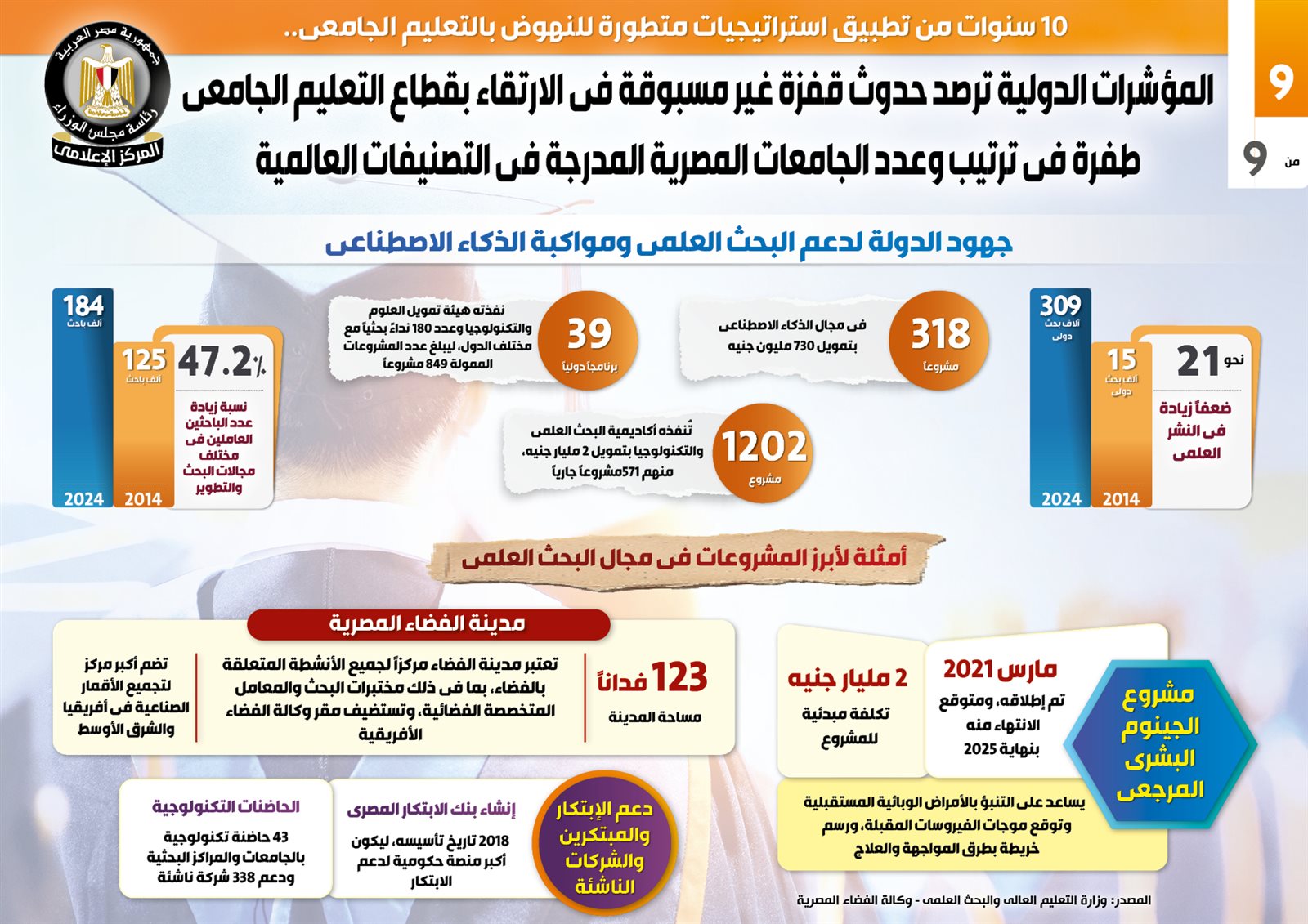 يأتي هذا فيما نفذت أكاديمية البحث العلمي والتكنولوجيا 1202 مشروع بتمويل 2 مليار جنيه، منهم 571 مشروعًا جاريًا، بجانب 318 مشروعًا في مجال الذكاء الاصطناعي بتمويل 730 مليون جنيه، بالإضافة إلى 39 برنامجًا دوليًا نفذته هيئة تمويل العلوم والتكنولوجيا و180 نداءً بحثيًا مع مختلف الدول، ليبلغ عدد المشروعات الممولة 849 مشروعًا.