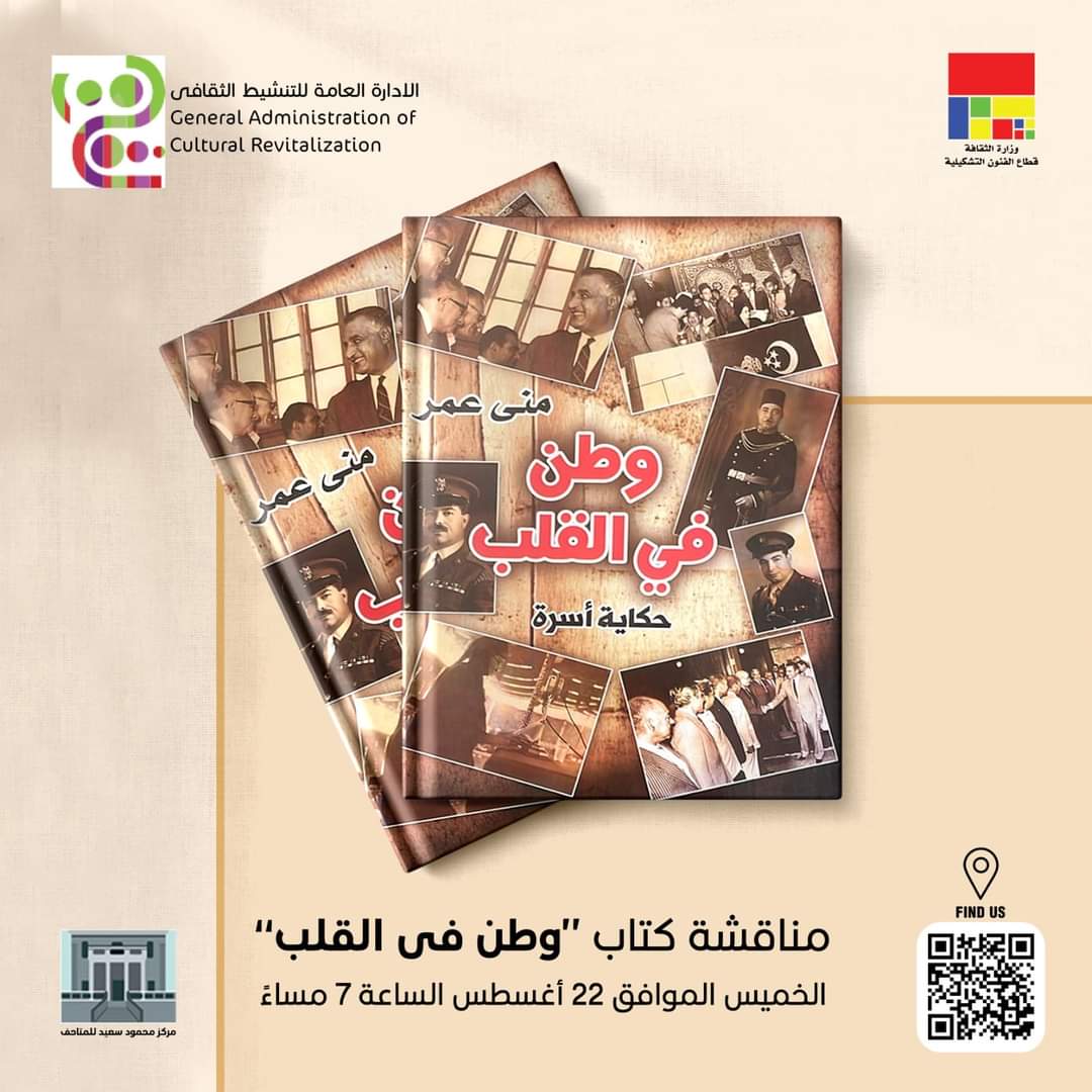 ويناقش “صالون محمود سعيد” كتاب بعنوان ( وطن فى القلب – حكاية أسرة ) للكاتبة منى عمر عضو مجلس النواب، وذلك بحضور الشاعر جابر بسيونى أمين صندوق وعضو مجلس إدارة اتحاد كتاب مصر، الدكتور مدحت عيسى مدير مركز المخطوطات بمكتبه الاسكندريه، الدكتور محمد الحداد استاذ مساعد النقد الادبي والبلاغة بجامعة القصيم، ويدير الحوار الاعلامى مجدى فكرى مدير البرامج الثقافية اذاعة بالإسكندرية سابقا.