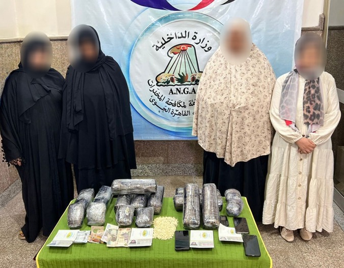 وعقب تقنين الإجراءات تم ضبط 4 من عناصر التشكيل "سيدات" أثناء إنهاء إجراءات سفرهن على متن إحدى الرحلات الجوية بميناء القاهرة الجوى، وبحوزتهن (19 كيلو جرام لعقار الكبتاجون المخدر) مخبأة بمخبئ سرى داخل الكراسى المتحركة الخاصة بهن وكذا طيات ملابسهن، كما تم ضبط باقى عناصر التشكيل وبحوزتهم (100 ألف قرص لعقار الكبتاجون المخدر - كمية من الأقراص المؤثرة ).