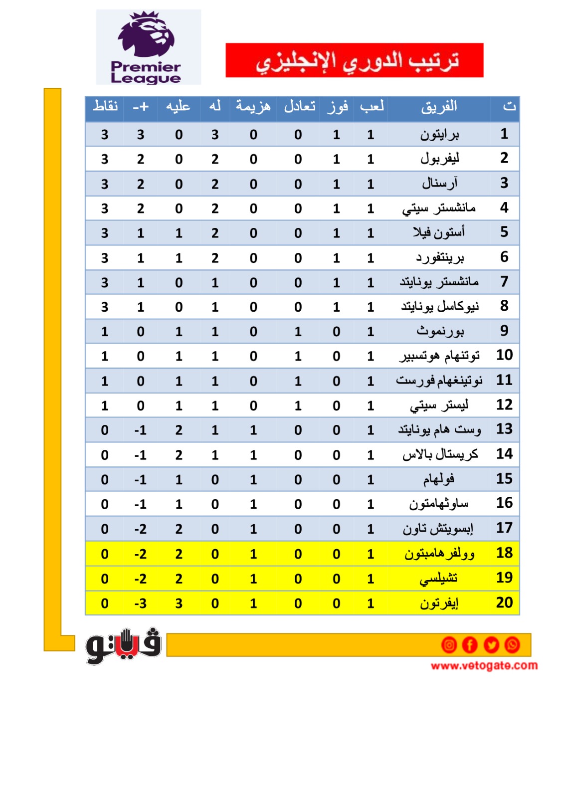 ترتيب الدوري الإنجليزي الممتاز بعد الجولة الأولى