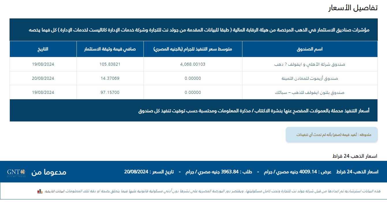 مؤشر الذهب، صعد مؤشر صناديق الاستثمار في الذهب من جديد بتعاملات اليوم الثلاثاء الموافق 20 أغسطس 2024، ليلامس جرام الذهب عيار 24 نحو 4009.14 جنيه للعرض ونحو 3963.84 جنيه للطلب.