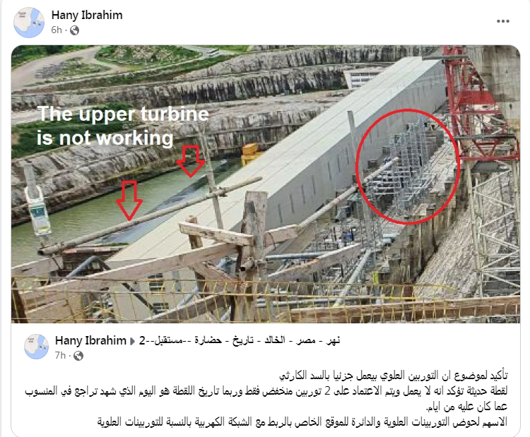 وتابع الباحث هاني إبراهيم بشأن تشغيل توربينات سد النهضة "تأكيدًا لموضوع أن التوربين العلوي يعمل جزئيًا بالسد الكارثي، لقطة حديثة تؤكد أنه لا يعمل ويتم الاعتماد على 2 توربين منخفض فقط، وربما تاريخ اللقطة هو اليوم الذي شهد تراجع في المنسوب عما كان عليه من أيام".