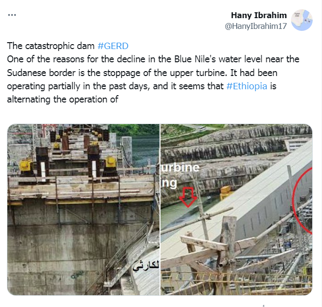 وكشف الباحث في حوض النيل هاني إبراهيم أن "السد الكارثي، سد النهضة، من أسباب انخفاض منسوب مياه النيل الأزرق بالقرب من الحدود السودانية، توقف التوربينة العلوية التي كانت تعمل جزئيا خلال الأيام الماضية"