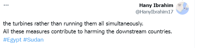 وقال الباحث هاني إبراهيم إنه "يبدو أن إثيوبيا تقوم بالتناوب على تشغيل التوربينة العلوية، التوربينات بدلًا من تشغيلها جميعًا في وقت واحد. كل هذه الإجراءات تساهم في الإضرار بدول المصب".