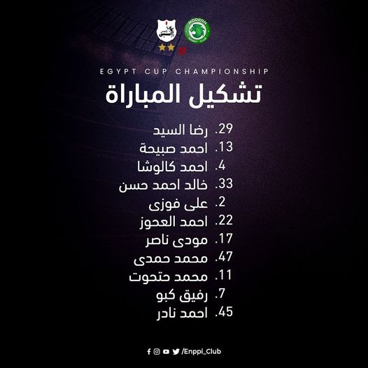 ويجلس على مقاعد البدلاء: أحمد يحيى، محمد محمود، علي الفيل، هشام عادل، علي ياسر، عمر وائل، عبد الرحمن رشدان، محمد زعلوك، محمد نصير.