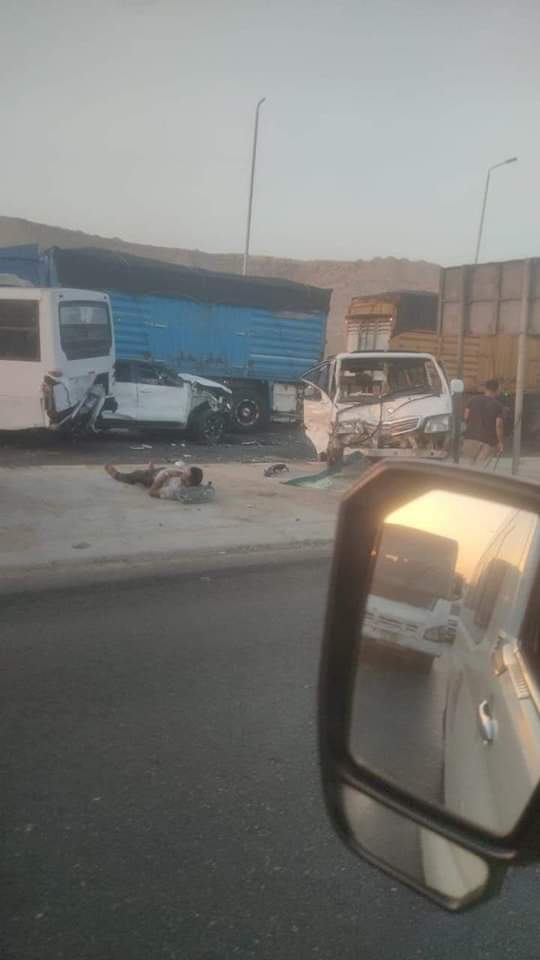 وكشف الفحص المبدئى،تصادم سيارتي نقل أحدهما تحمل مواد بناء “ رمال”، وهو ما تسبب في توقف عدد من السيارات على الطريق، وتلها سيارة نقل دهست عددا من السيارات المتوقفة.