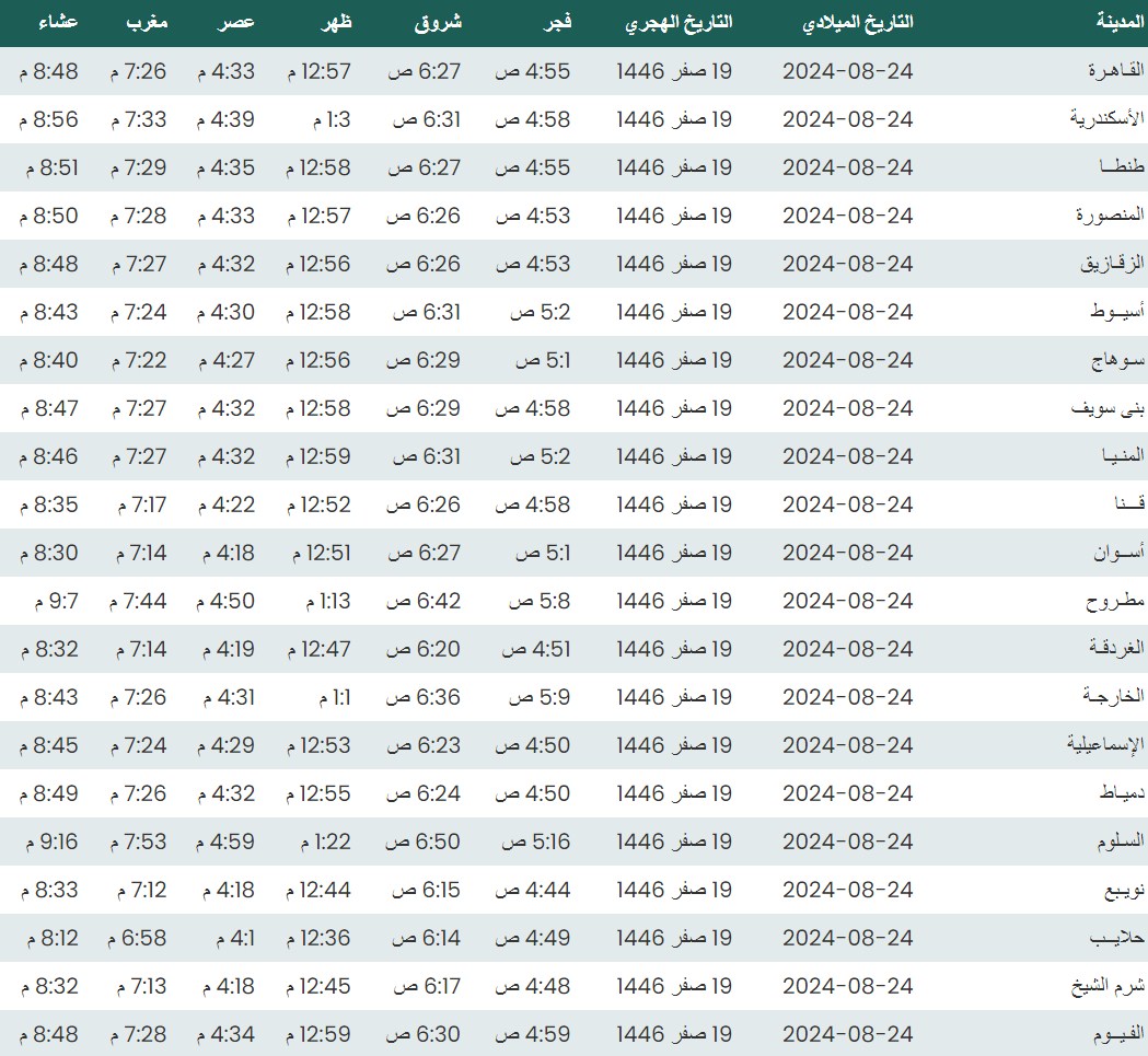 مواقيت الصلاة اليوم وفقًا للتوقيت المحلي لمدينتي القاهرة والإسكندرية وكذلك،مواقيت الصلاة، لعدد من مدن ومحافظات الجمهورية من واقع بيانات الهيئة العامة للمساحة