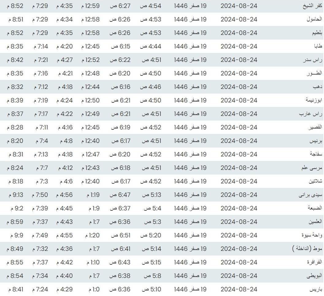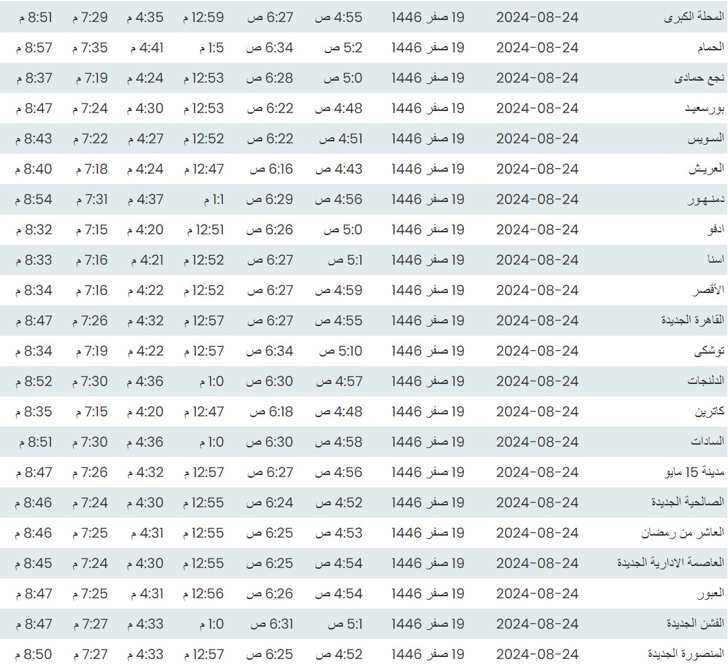 وفيما يلي مواقيت الصلاة، لعدد من مدن ومحافظات الجمهورية من واقع بيانات الهيئة العامة للمساحة