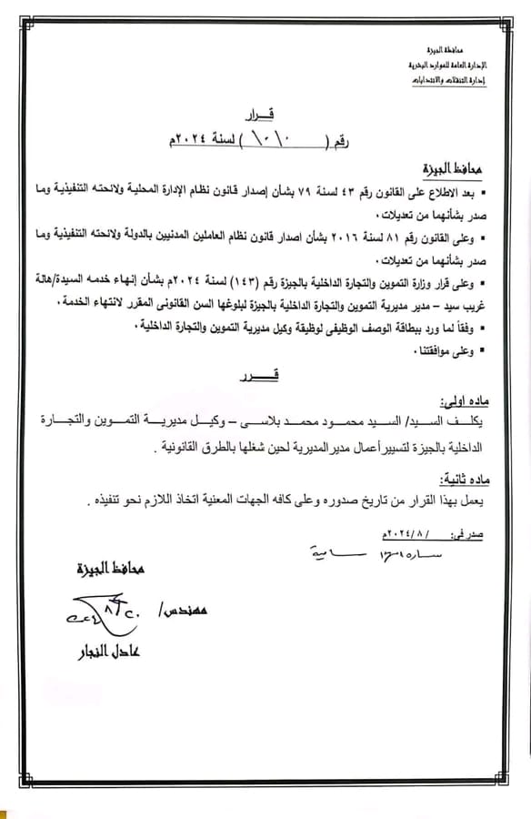 ويأتي هذا القرار بعد انتهاء خدمة هالة غريب سيد، مدير مديرية التموين السابق والتي بلغت السن القانونية للتقاعد.