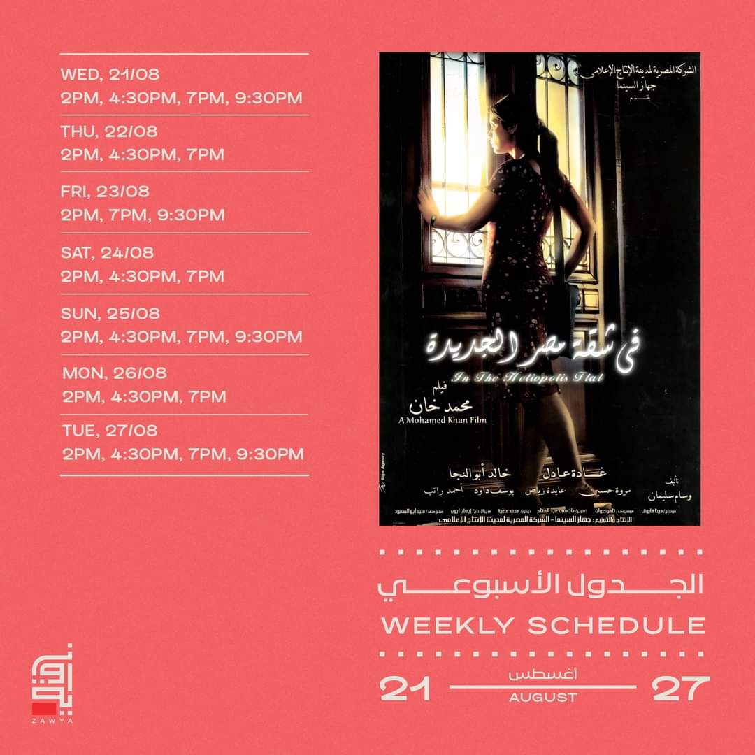 وأعلنت سينما زاوية ابتداءً من اليوم الأربعاء 21 أغسطس عن مد عرض الفيلم بشاشات السينما أسبوعا آخر فى المواعيد التالية: