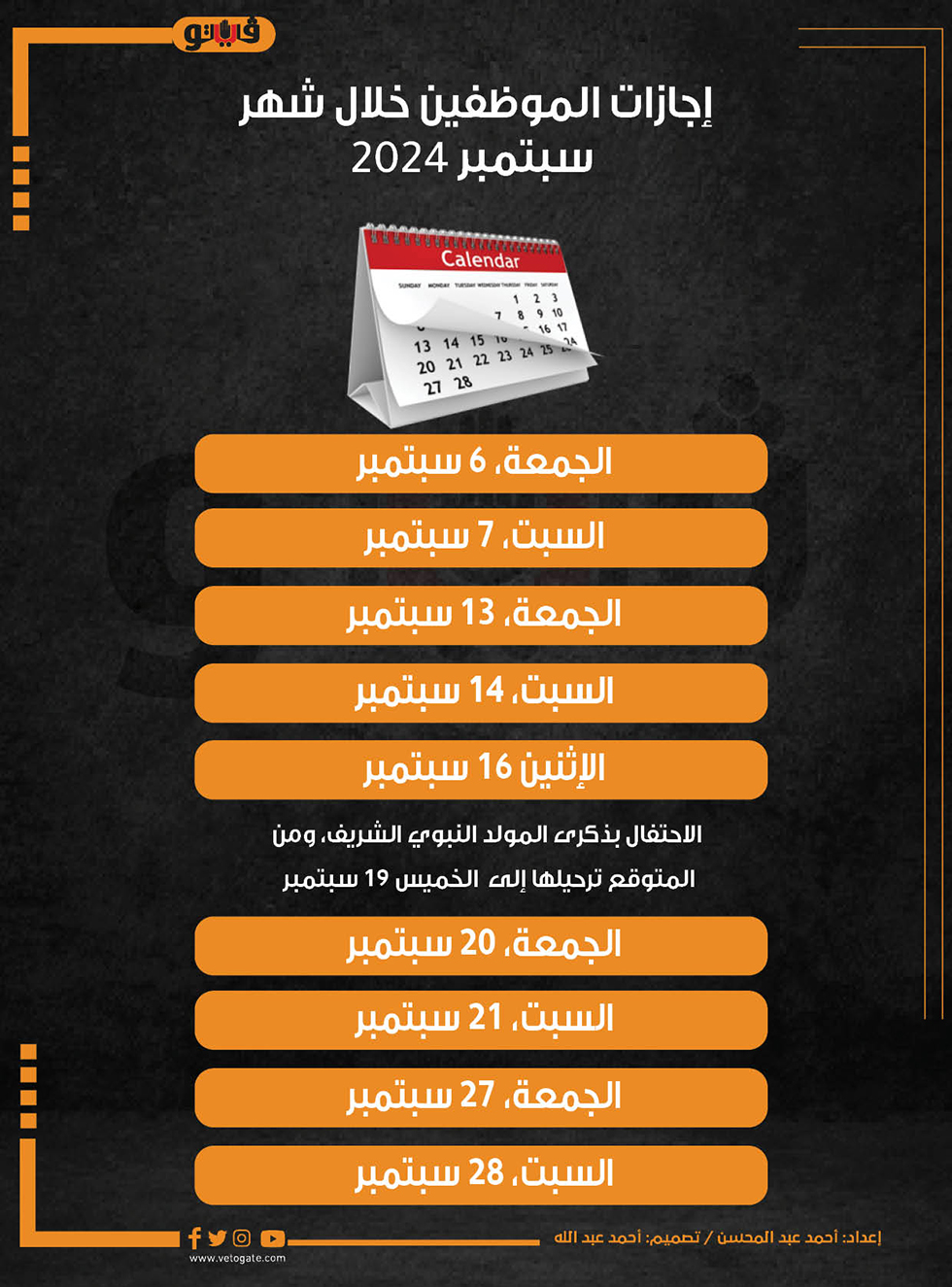 إجازات الموظفين خلال شهر سبتمبر 2024 (إنفوجراف) الأربعاء 21/أغسطس/2024 - 08:40 م 8/21/2024 8:40:36 PM إجازات الموظفين أحمد عبدالمحسن شارك طباعة 18 حجم الخط شارك طباعة الاحتفال بذكرى المولد النبوي الشريف اجازات الموظف اجازات الموظفين الاحتفال بذكرى المولد النبوي المولد النبوي الشريف ذكري المولد النبوي الشريف الموظفين