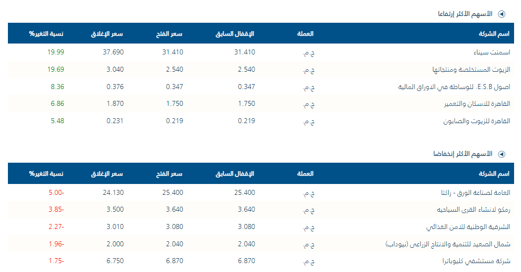 البورصة المصرية، حركة الأسهم الأكثر ارتفاعا وانخفاضا بمنتصف تعاملات اليوم