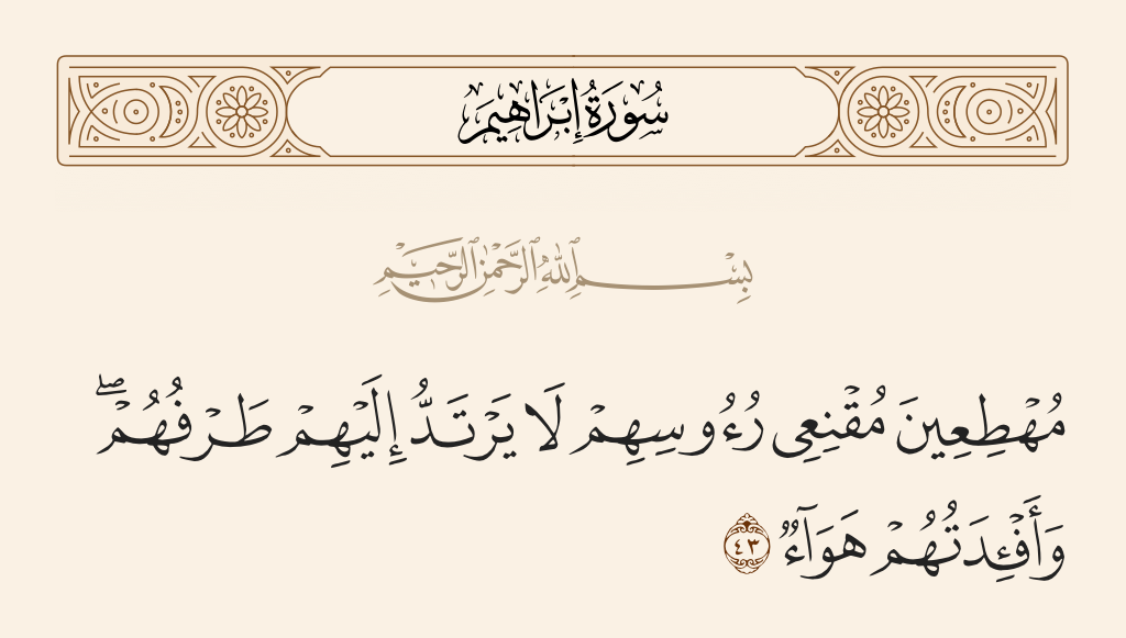 قال تعالى: «مُهْطِعِينَ مُقْنِعِي رُءُوسِهِمْ لَا يَرْتَدُّ إِلَيْهِمْ طَرْفُهُمْ وَأَفْئِدَتُهُمْ هَوَاءٌ».