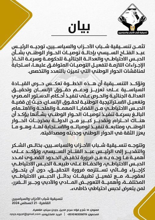 ثمنت تنسيقية شباب الأحزاب والسياسيين، توجيه الرئيس عبد الفتاح السيسي بإحالة توصيات الحوار الوطني بشأن الحبس الاحتياطي والعدالة الجنائية للحكومة وسرعة اتخاذ الإجراءات اللازمة لتفعيل التوصيات المتوافق عليها، استجابةً لمناقشات الحوار الوطني التي تميزت بالتعدد والتخصص.
