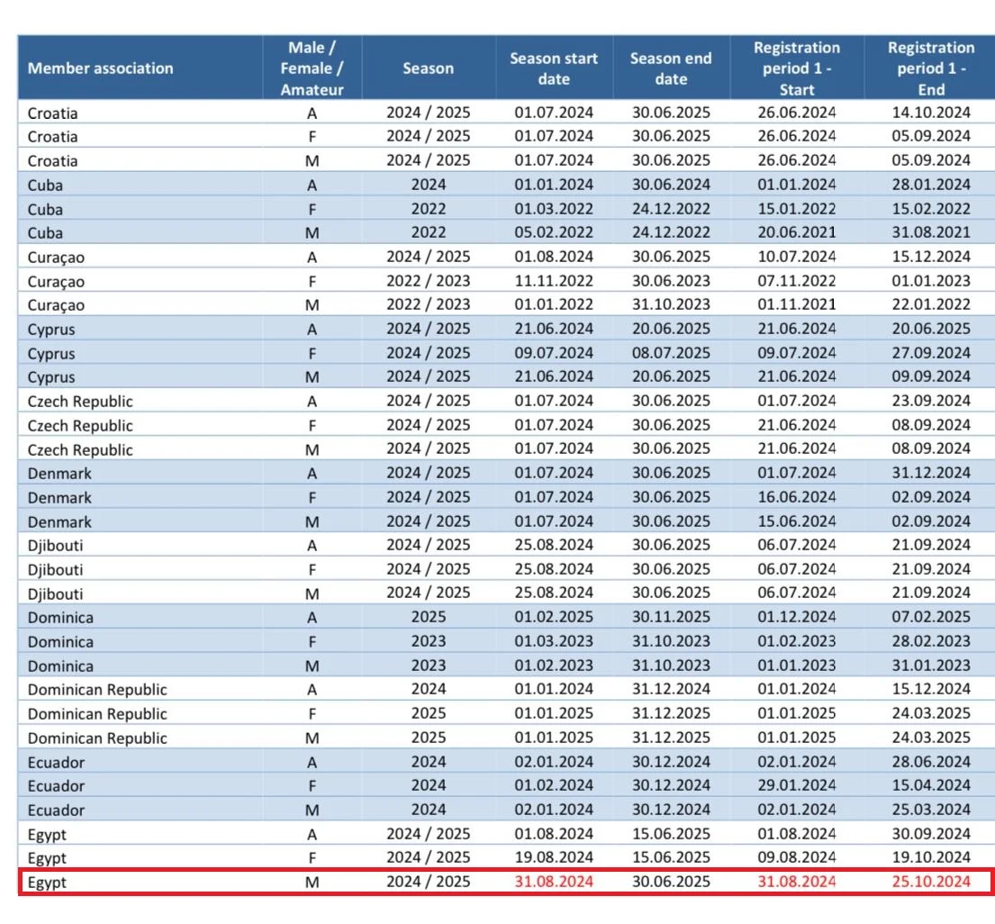 ونشر "فيفا" عبر موقعه، أن القيد في مصر يبدأ في 31 أغسطس الجارى ويستمر حتى 25 أكتوبر المقبل، وذلك بعد انتهاء الموسم 2023/ 2024 بنهاية كأس مصر الذى ينتهى 30 أغسطس بالنهائى، والقيد الشتوي من 1 يناير حتي 31 يناير