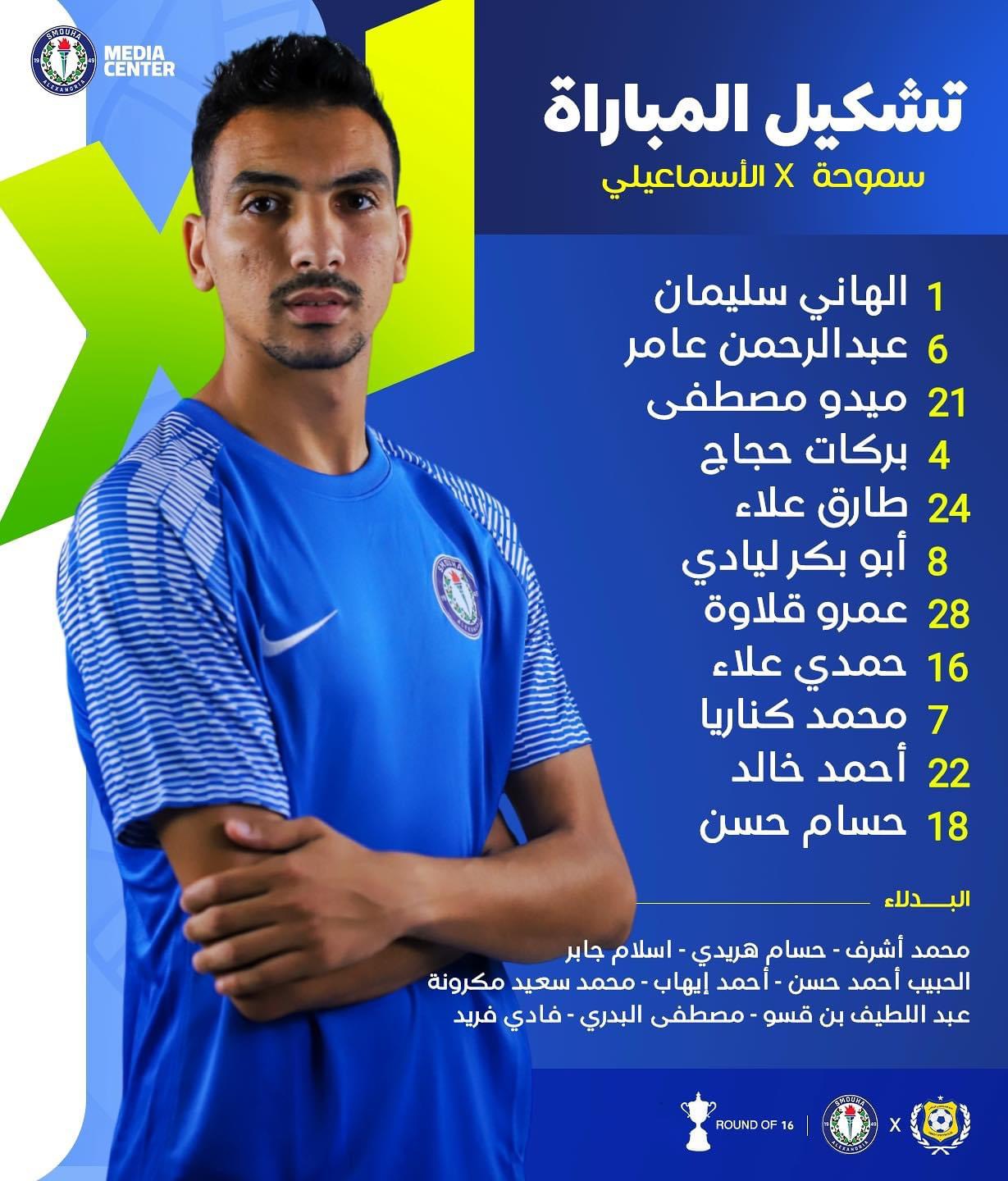 أعلن أحمد سامي مدرب فريق سموحة عن تشكيل فريقه لمواجهة الإسماعيلي في المباراة المقرر أن تجمع بينهما مساء اليوم على استاد الإسماعيلية ضمن منافسات دور الـ 16 من بطولة كأس مصر.