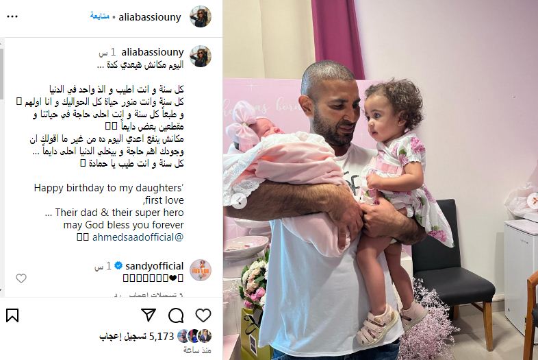 في هذا السياق، نشرت علياء، صور لـأحمد سعد، مع ابنته، معلقة عليها بقولها: “اليوم مكانش هيعدي كدة، كل سنة وأنت أطيب والذ واحد في الدنيا، كل سنة وأنت منور حياة كل اللي حواليك وأنا أولهم، وطبعًا كل سنة وأنت أحلى حاجة في حياتنا ومقطعين بعض دايمًا”.