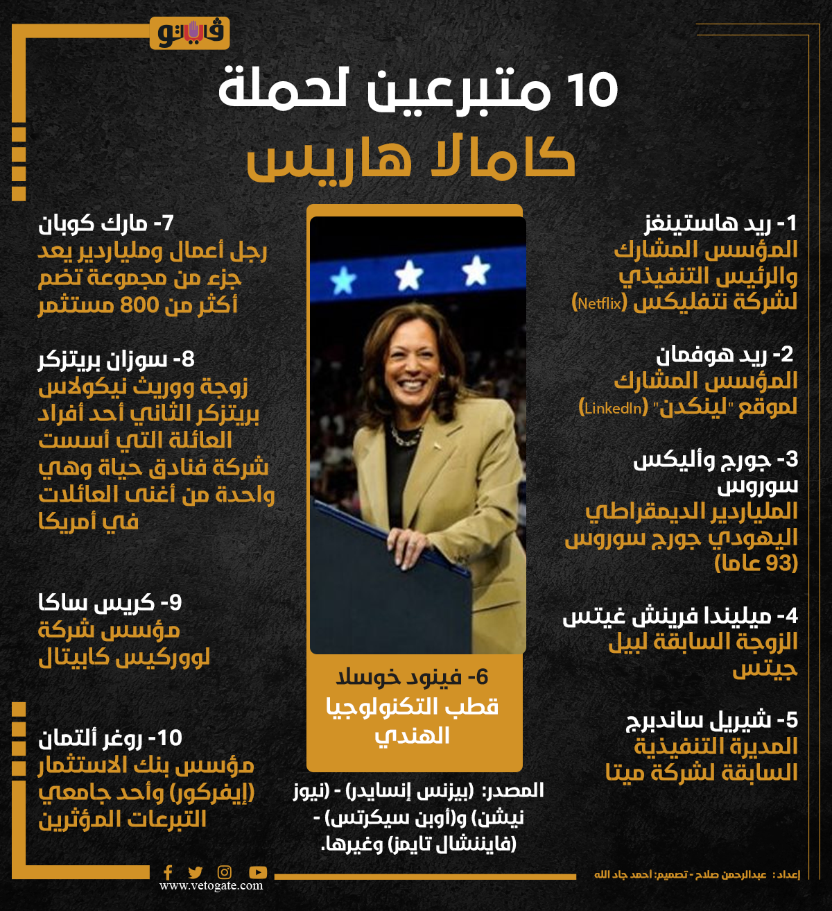 10 متبرعين لحملة كامالا هاريس (إنفوجراف) الخميس 22/أغسطس/2024 - 09:31 م 8/22/2024 9:31:33 PM هاريس، فيتو عبدالرحمن صلاح شارك طباعة 18 حجم الخط شارك طباعة هاريس كاميلا هاريس الانتخابات الأمريكية الانتخابات الرئاسية الأمريكية ترامب الحزب الديمقراطي