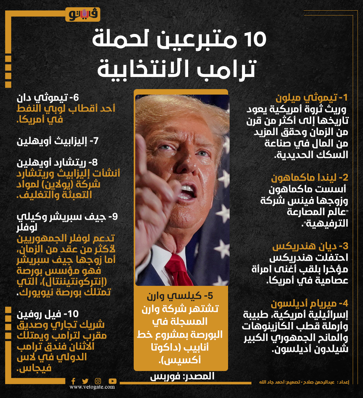 10 متبرعين لحملة ترامب الانتخابية (إنفوجراف) الخميس 22/أغسطس/2024 - 08:13 م 8/22/2024 8:13:49 PM ترامب، فيتو عبدالرحمن صلاح شارك طباعة 18 حجم الخط شارك طباعة ترامب الانتخابات الأمريكية الانتخابات الرئاسية الأمريكية كاميلا هاريس أمريكا الولايات المتحدة