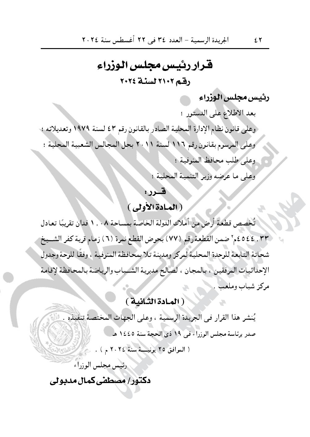 -قرار رئيس الوزراء رقم 2102 لسنة 2024، بشأن تخصيص قطعة أرض من أملاك الدولة الخاصة بمساحة 1٫08 فدان تقريبًا، تعادل 4544٫33م، ضمن القطعة رقم (77) بحوض القطع نمرة (6) زمام قرية كفر الشيخ شحاتة التابعة للوحدة المحلية لمركز ومدينة تال بمحافظة المنوفية، بالمجان، لصالح مديرية الشباب والرياضة بالمحافظة لإقامة مركز شباب وملعب.