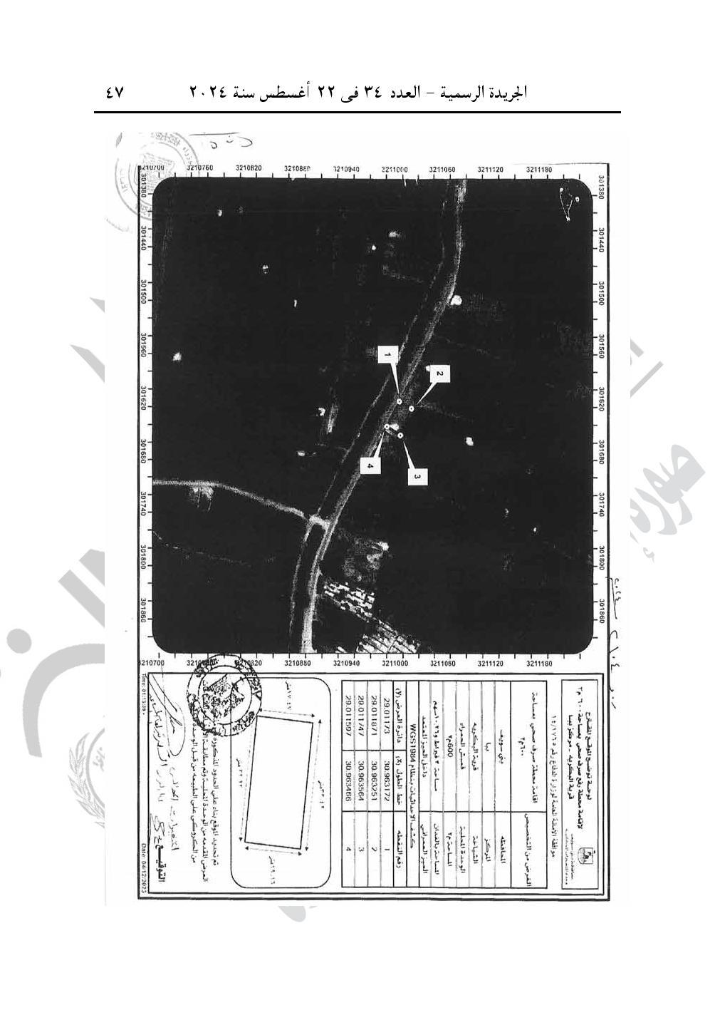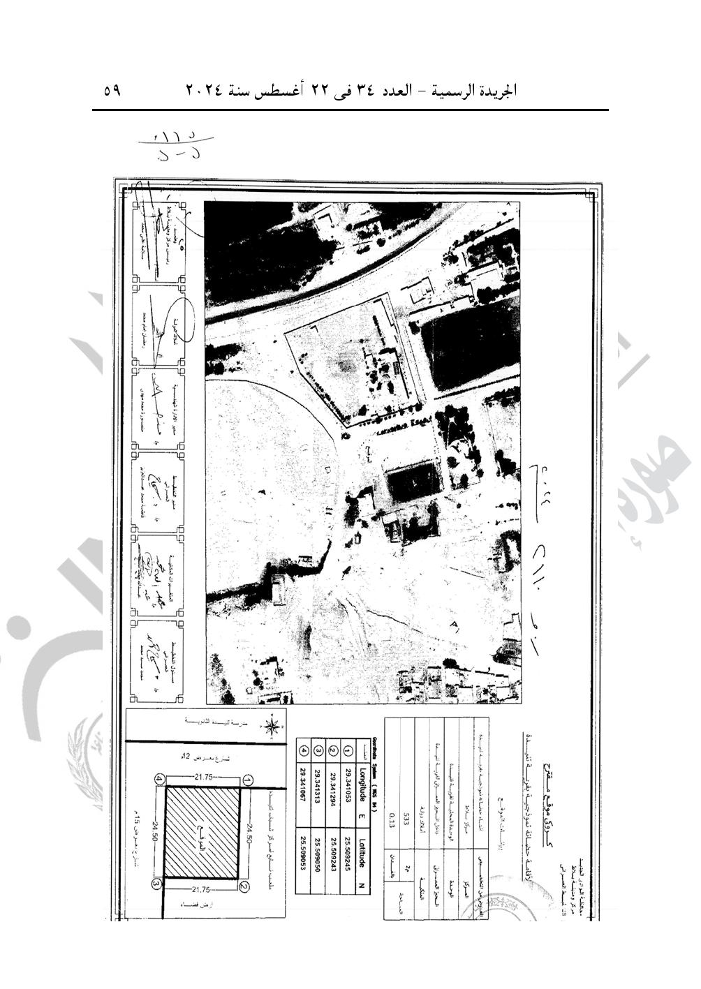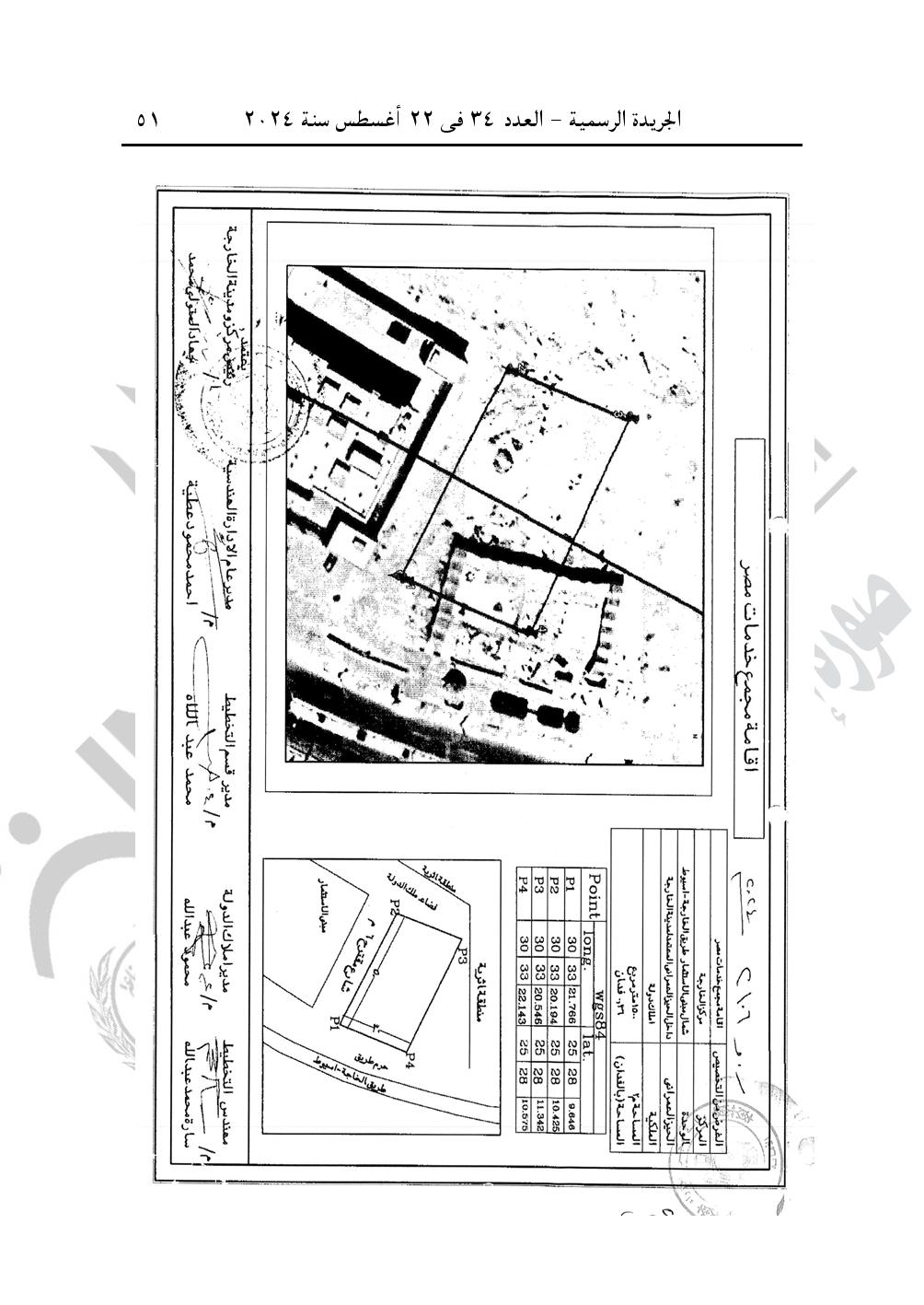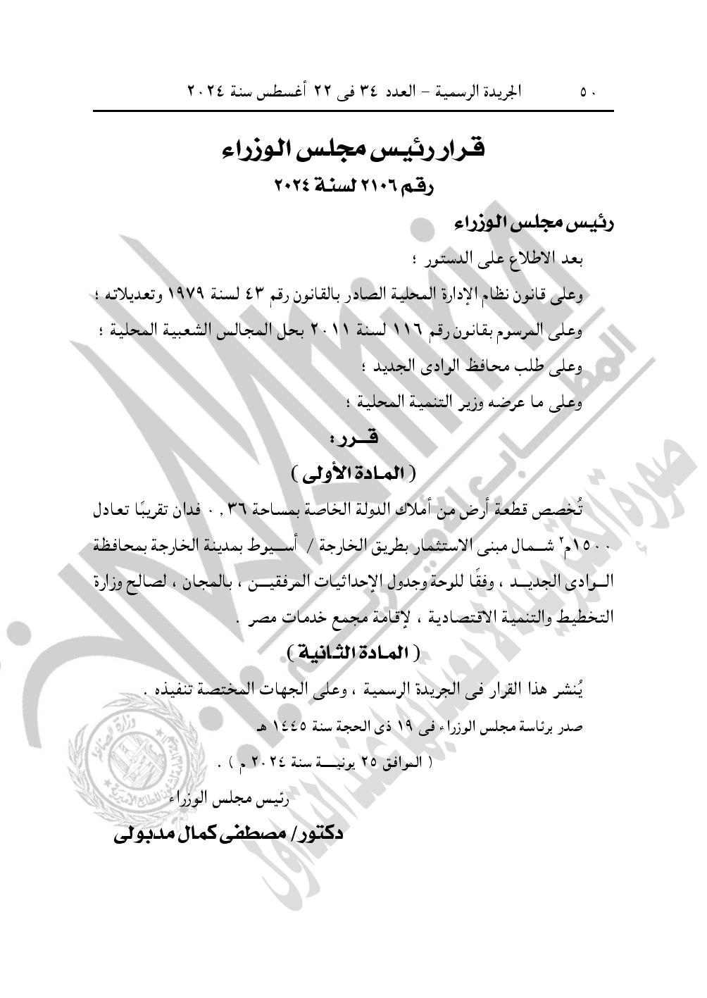-وقرار رئيس مجلس الوزراء رقم 2106 لسنة 2024، بتخصيص قطعة أرض من أملاك الدولة الخاصة بمساحة 0٫36 فدان تقريبًا، تعادل 1500 متر مربع شمال مبنى الاستثمار بطريق الخارجة/ أسيوط بمدينة الخارجة بمحافظة الوادى الجديد، بالمجان، لصالح وزارة التخطيط والتنمية الاقتصادية، لإقامة مجمع خدمات مصر.