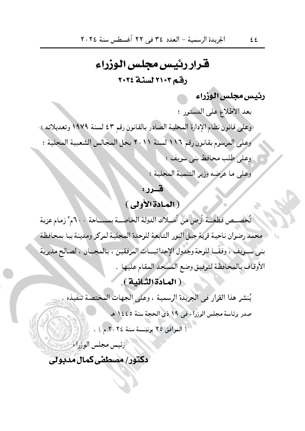 -وقرار رئيس مجلس الوزراء رقم 2103 لسنـة 2024، بشأن تخصيص قطعة أرض من أملاك الدولة الخاصة بمساحة 600 متر مربع، زمام عزبة محمد رضوان ناحية قرية جبل النور، التابعة للوحدة المحلية لمركز ومدينة ببا بمحافظة بنى سويف، بالمجان، لصالح مديرية الأوقاف بالمحافظة لتوفيق وضع المسجد المقام عليها.