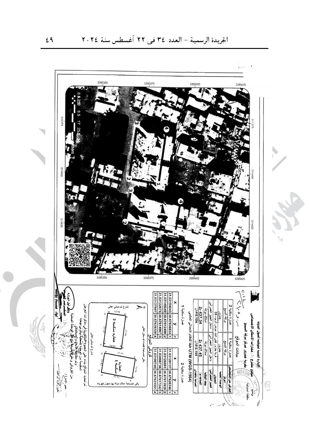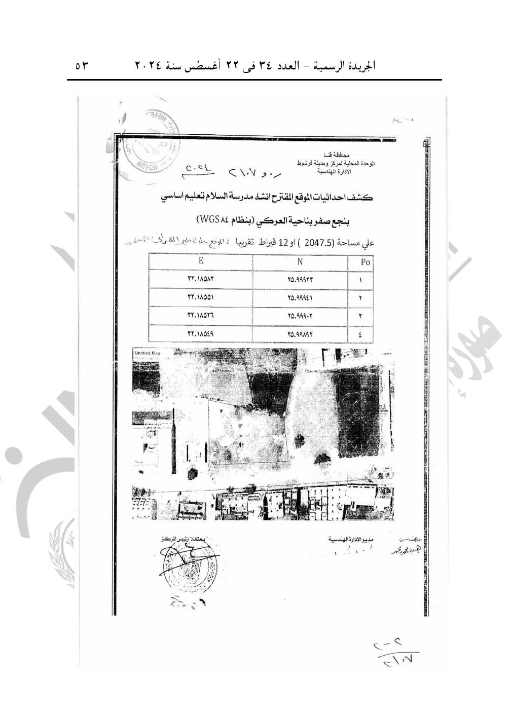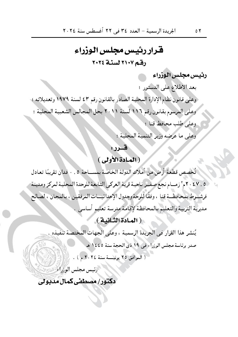 -وقرار رئيس مجلس الوزراء رقـم 2107 لسنـة 2024، بتخصيص قطعة أرض من أملاك الدولة الخاصة بمس احة 0٫5 فدان تقريبًا، تعادل 2047٫5 متر مربع، زمام نجع صفر ناحية قرية العركى، التابعة للوحدة المحلية لمركز ومدينة فرشوط بمحافظة قنا، بالمجان، لصالح مديرية التربية والتعليم بالمحافظة لإقامة مدرسة تعليم أساسى.