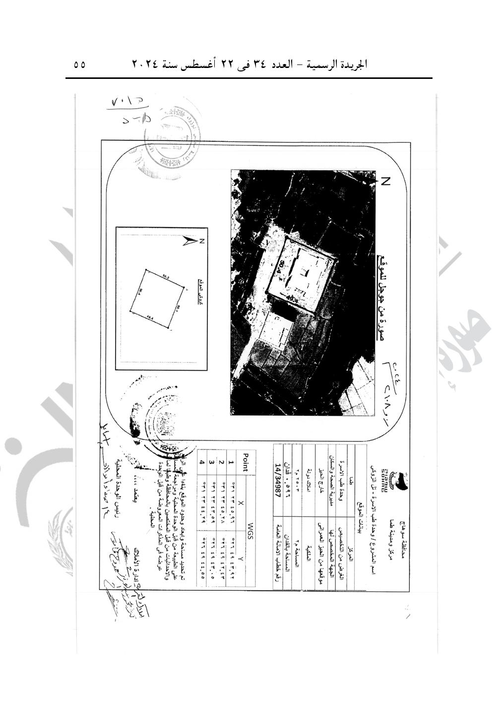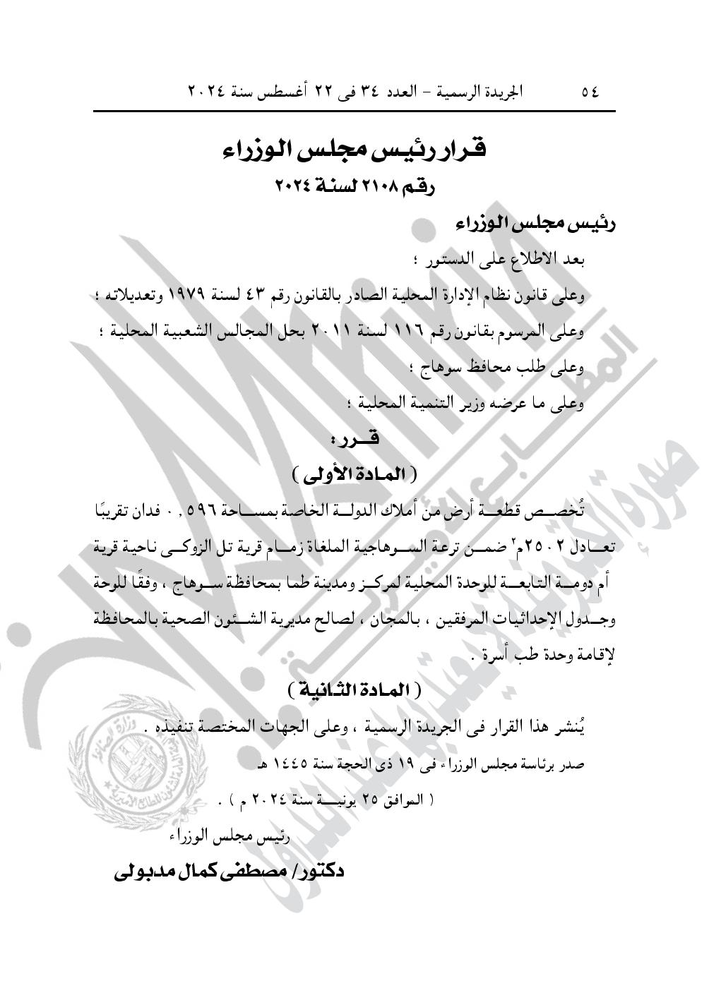 -وقرار رئيس مجلس الـوزراء رقـم 2108 لسنة 2024، بتخصيص قطعة أرض من أملاك الدولة الخاصة بمساحة 0٫596 فدان تقريبًا، تعادل 2502متر مربع، ضمن ترعة السوهاجية الملغاة زمام قرية تل الزوكى، ناحية قرية أم دومة التابعة للوحدة المحلية لمركز ومدينة طما بمحافظة سوهاج، بالمجان، لصالح مديرية الشئون الصحية بالمحافظة لإقامة وحدة طب أسرة.