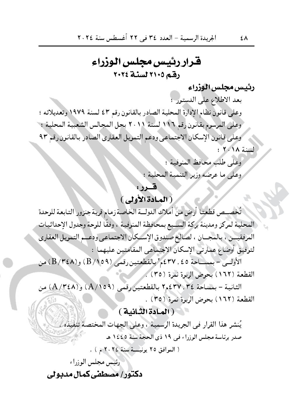 -وقرار رئيس مجلس الوزراء رقم 2105 لسنة 2024، بتخصيص قطعتي أرض من أملاك الدولة الخاصة زمام قرية جنزور التابعة للوحدة المحلية لمركز ومدينة بركة السبع بمحافظة المنوفية، وفقًا للوحة وجدول الإحداثيات، بالمجان، لصالح صندوق الإسكان الاجتماعى ودعم التمويل العقارى لتوفيق أوضاع عمارتى الإسكان الاجتماعى.