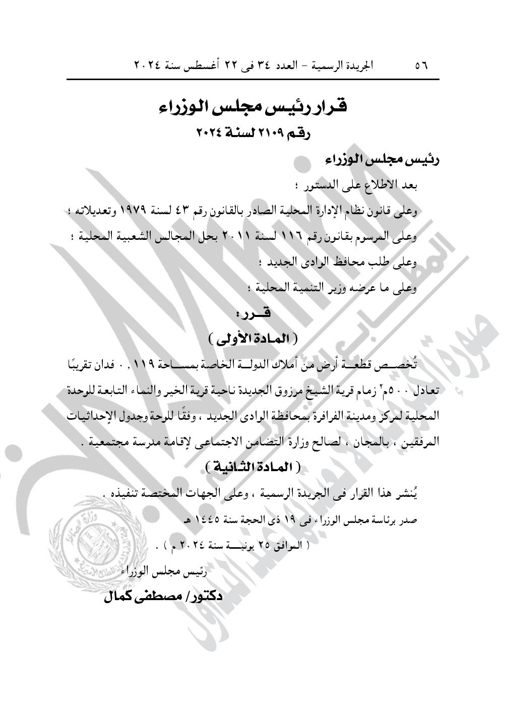 -وقرار رئيس مجلـس الوزراء رقـم 2109 لسنة 2024، بتخصيص قطعة أرض من أملاك الدولة الخاصة بمساحة 0٫119 فدان تقريبًا، تعادل 500متر مربع، زمام قرية الشيخ مرزوق الجديدة ناحية قرية الخير والنماء التابعة للوحدة المحلية لمركز ومدينة الفرافرة بمحافظة الوادى الجديد، بالمجان، لصالح وزارة التضامن الاجتماعى لإقامة مدرسة مجتمعية.