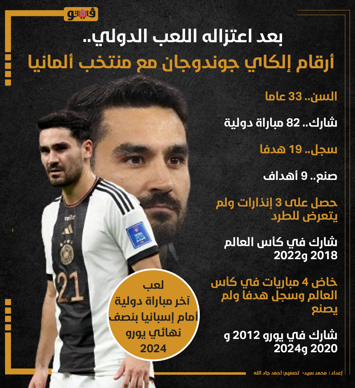 بعد اعتزاله اللعب الدولي.. أرقام إلكاي جوندوجان مع منتخب ألمانيا (إنفوجراف) الجمعة 23/أغسطس/2024 - 10:35 ص 8/23/2024 10:35:18 AM إلكاي جوندوجان، فيتو محمد سيد شارك طباعة 18 حجم الخط شارك طباعة جوندوجان إلكاي جوندوجان ألمانيا منتخب ألمانيا كأس العالم يورو 2024