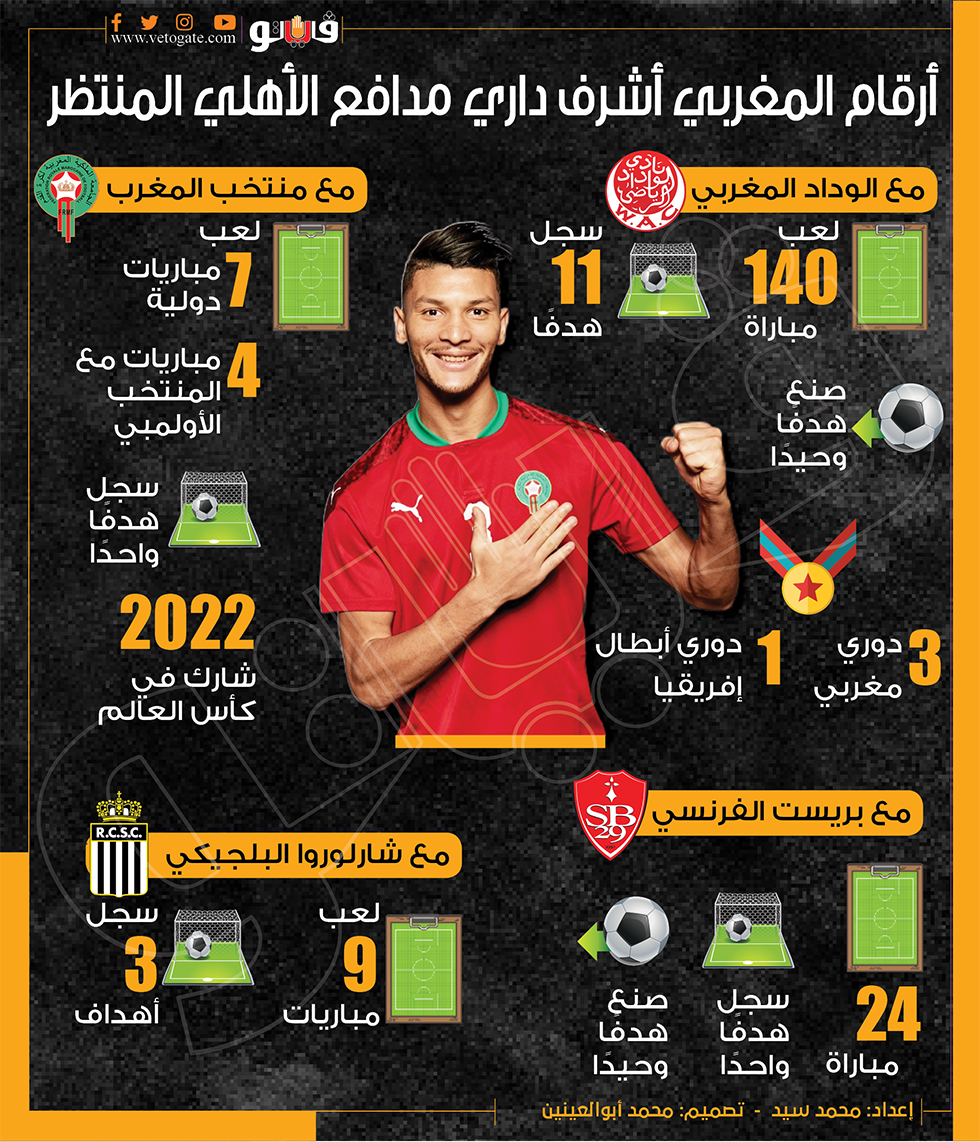 أرقام المغربي أشرف داري مدافع الأهلي المنتظر (إنفوجراف) الجمعة 23/أغسطس/2024 - 12:18 م 8/23/2024 12:18:06 PM أشرف داري، فيتو محمد سيد شارك طباعة 18 حجم الخط شارك طباعة أشرف داري الأهلي الوداد بريست المغرب