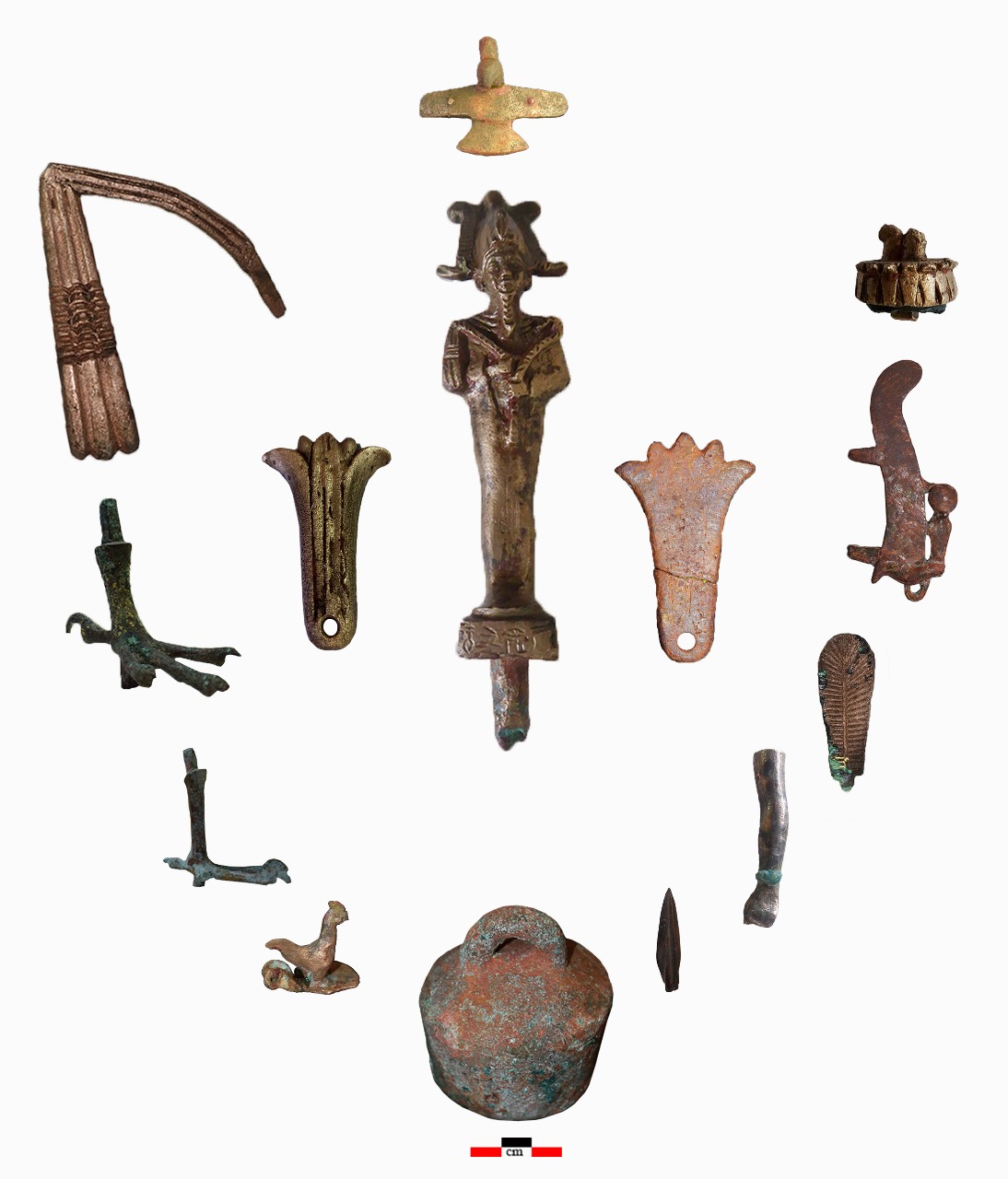 وأفاد الدكتور حسام غنيم مدير عام منطقة آثار كفر الشيخ ورئيس البعثة، أنه تم العثور أيضا بداخل مبنى المرصد على تمثال من الجرانيت الرمادي من عصر "واح إيب رع" من الأسرة السادسة والعشرين، وهو للكاهن بسماتيك سمن ويحمل تمثال المعبود أوزير ومدون عليه لقب حامل الختم الملكي، كما عثر أيضا على أداة المرخت التي تستخدم فى أعمال القياس، وكذلك القدم والإصبع وغيرها من أدوات القياس، بالإضافة إلى تمثال أوزير والنمس من البرونز، وتمثال تراكوتا للمعبود بس، وقلادة المنيت من الفاينس وبعض بقايا لوحات حجرية عليها بعض النقوش وموائد قرابين وبعض الأغطية لأمفورات من الملاط عليها بقايا أختام ترجع للعصر الصاوى، بالإضافة إلى تمثال للمعبود بتاح من الفاينس الأزرق، وبعض الرموز الدينية من الفاينس والتي تمثل أشكال مركبة للجد والواس والتاج المركب، وبعض اللقى الأثرية من الفخار المختلفة فى الأشكال والأحجام المستخدمة في الطقوس الدينية والحياة اليومية.